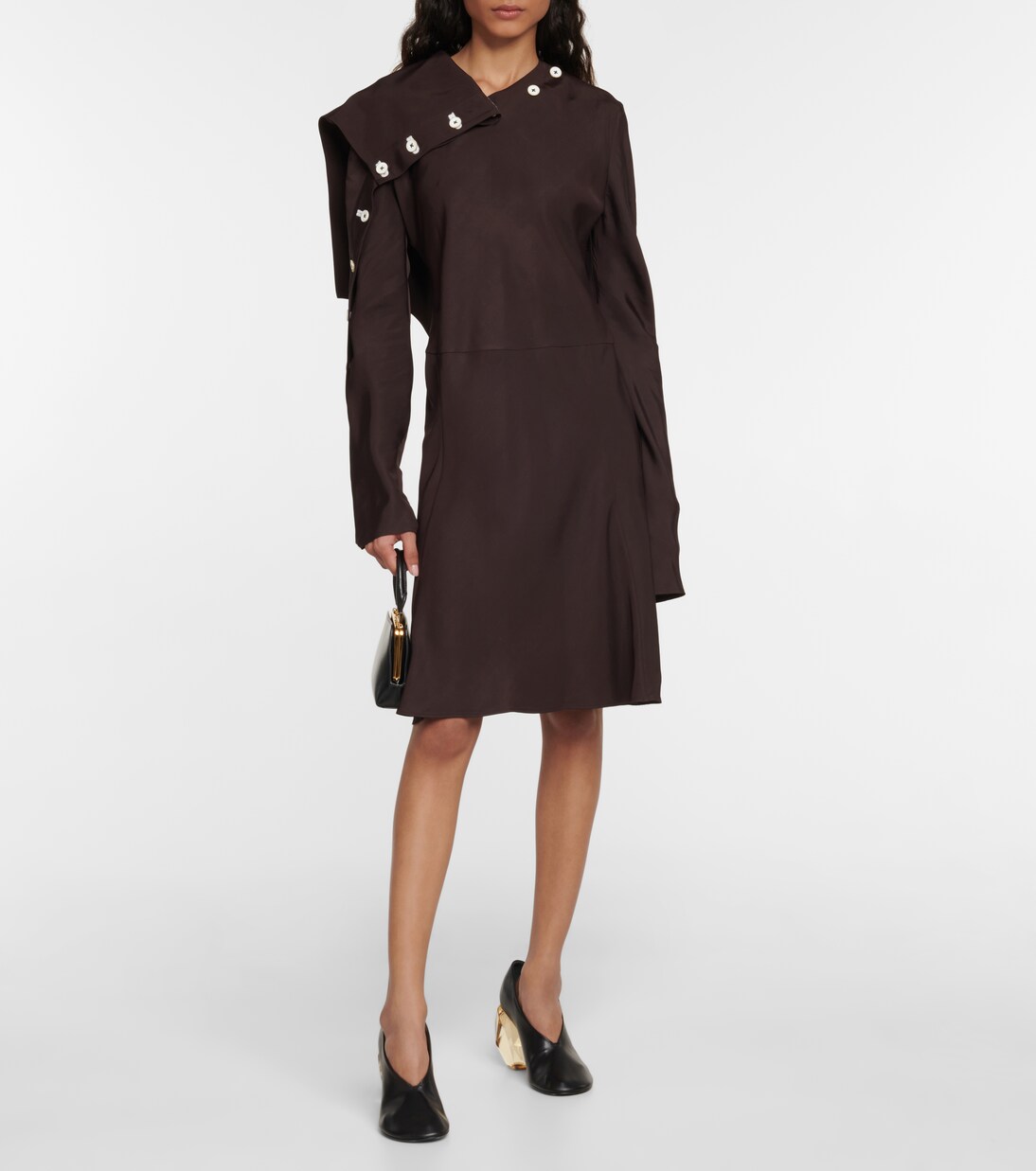 Инновационные элементы дизайна отличают это платье миди А-силуэта с подкладкой от Jil Sander. Изготовлено из легкой тафты в свободном силуэте, имеет конструкцию бюстье, контрастирующую с плиссированными рукавами-фонариками и манжетами на завязках.