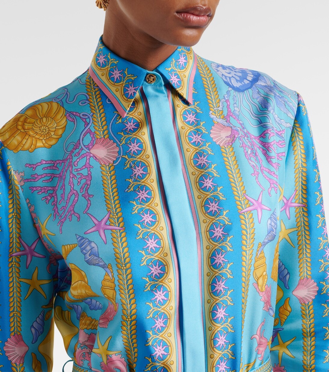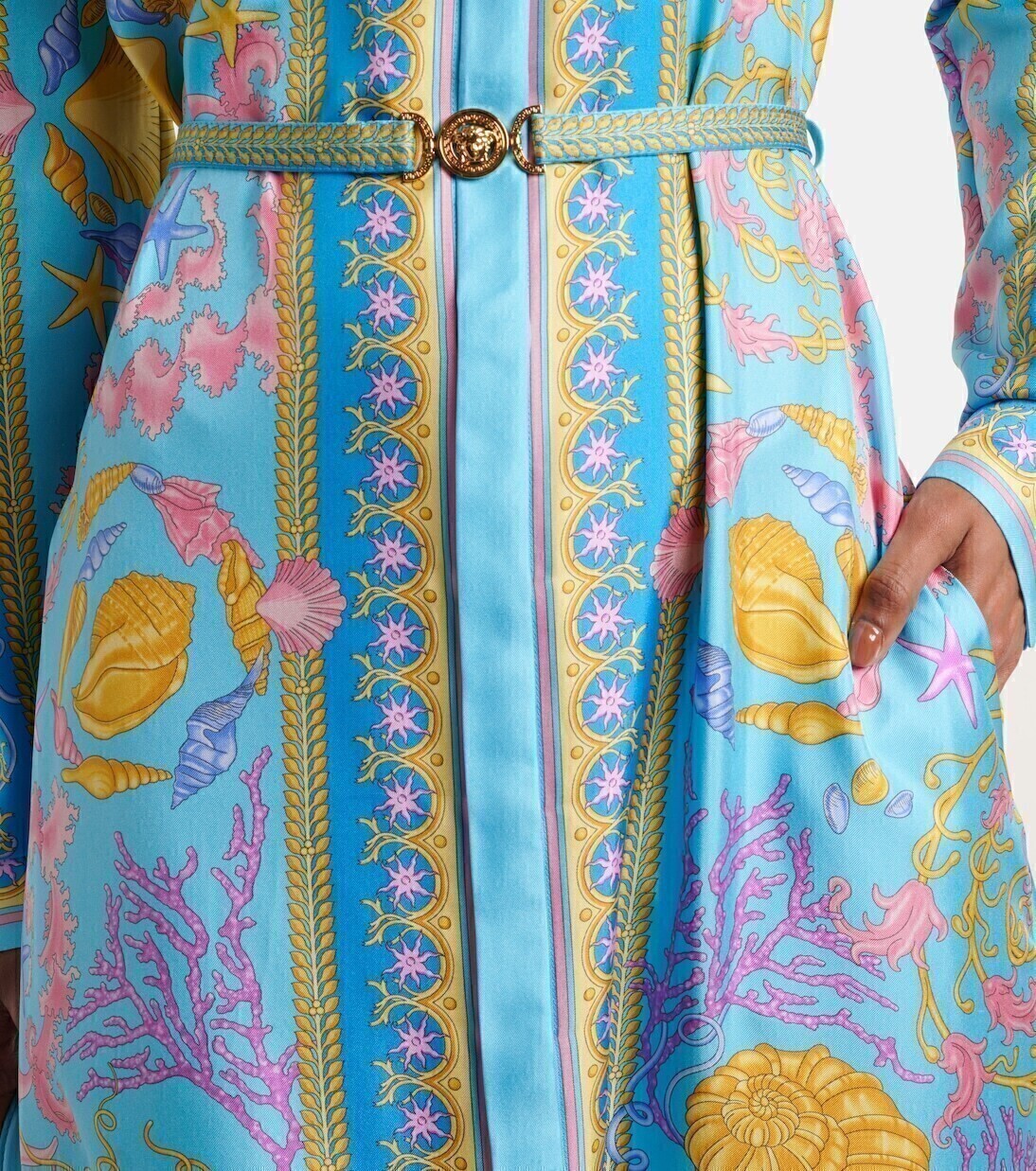 Капсульная коллекция La Vacanza от Versace переосмысливает фирменную эстетику барокко с помощью ярких подводных мотивов. Это макси-платье из шелкового твила скрывает застежку на пуговицы спереди и оснащено съемным поясом, украшенным фирменной фурнитурой Medusa.
