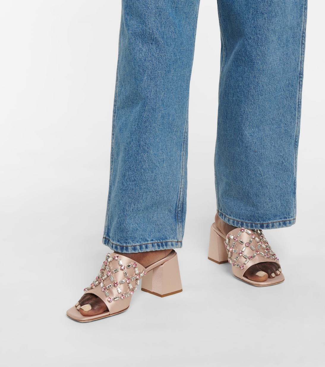 Когда ситуация требует от вас продемонстрировать свою декадентскую сторону, выбирайте эти сандалии от Miu Miu. Туфли из розового атласа украшены розовыми и белыми кристаллами и установлены на массивном блочном каблуке, передающем настроение 60-х, которое пронизывало подиум бренда сезона весна-лето 2021.