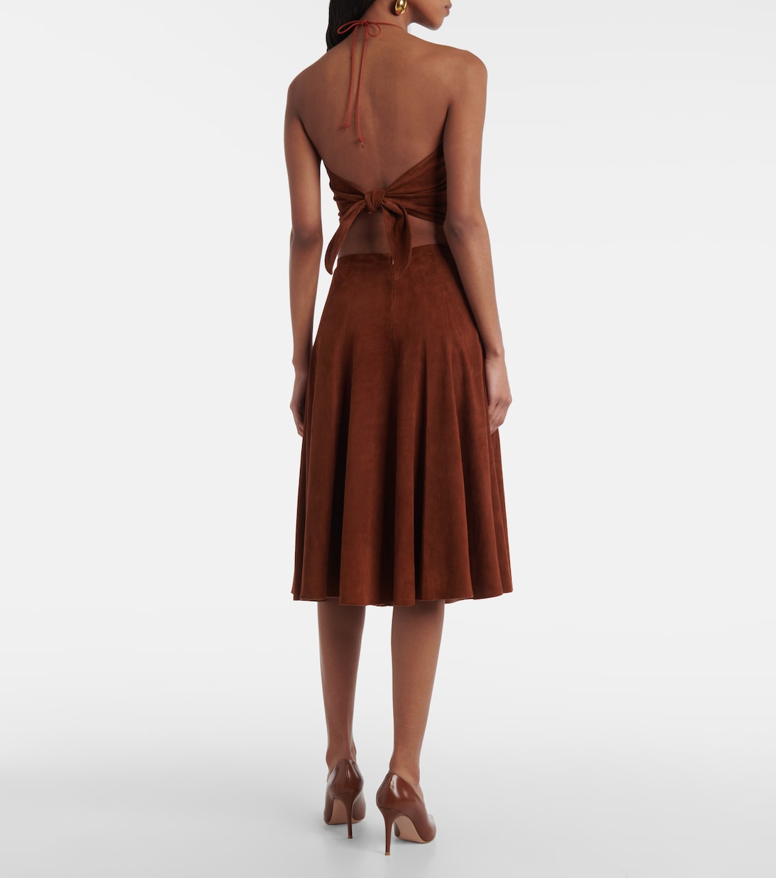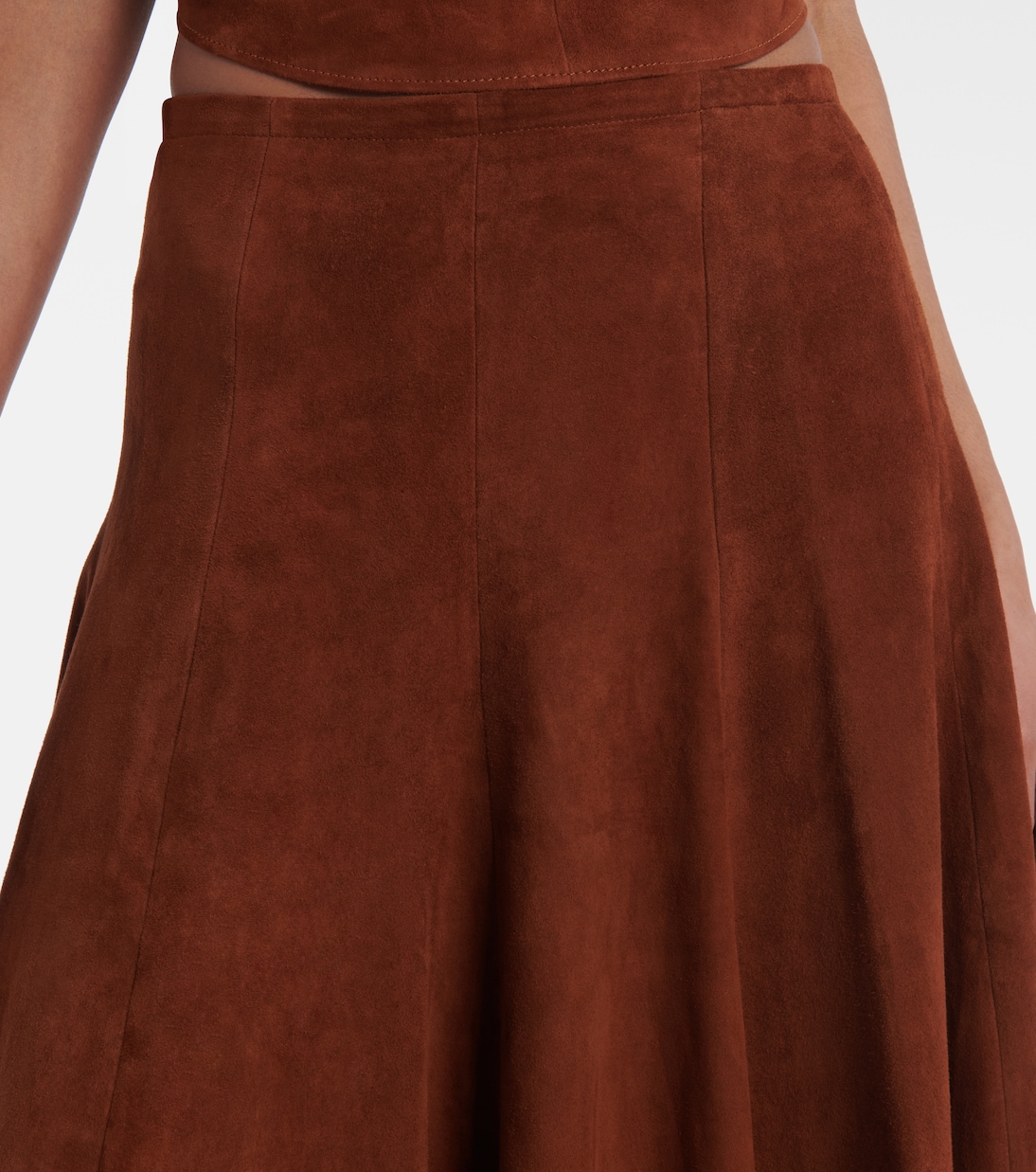Компания Stouls известна своими роскошными изделиями из кожи. Юбка миди Sabrina, выполненная из замши и подбитая смесовым шелком, воплощает изысканную элегантность благодаря А-образному силуэту и высокой талии.