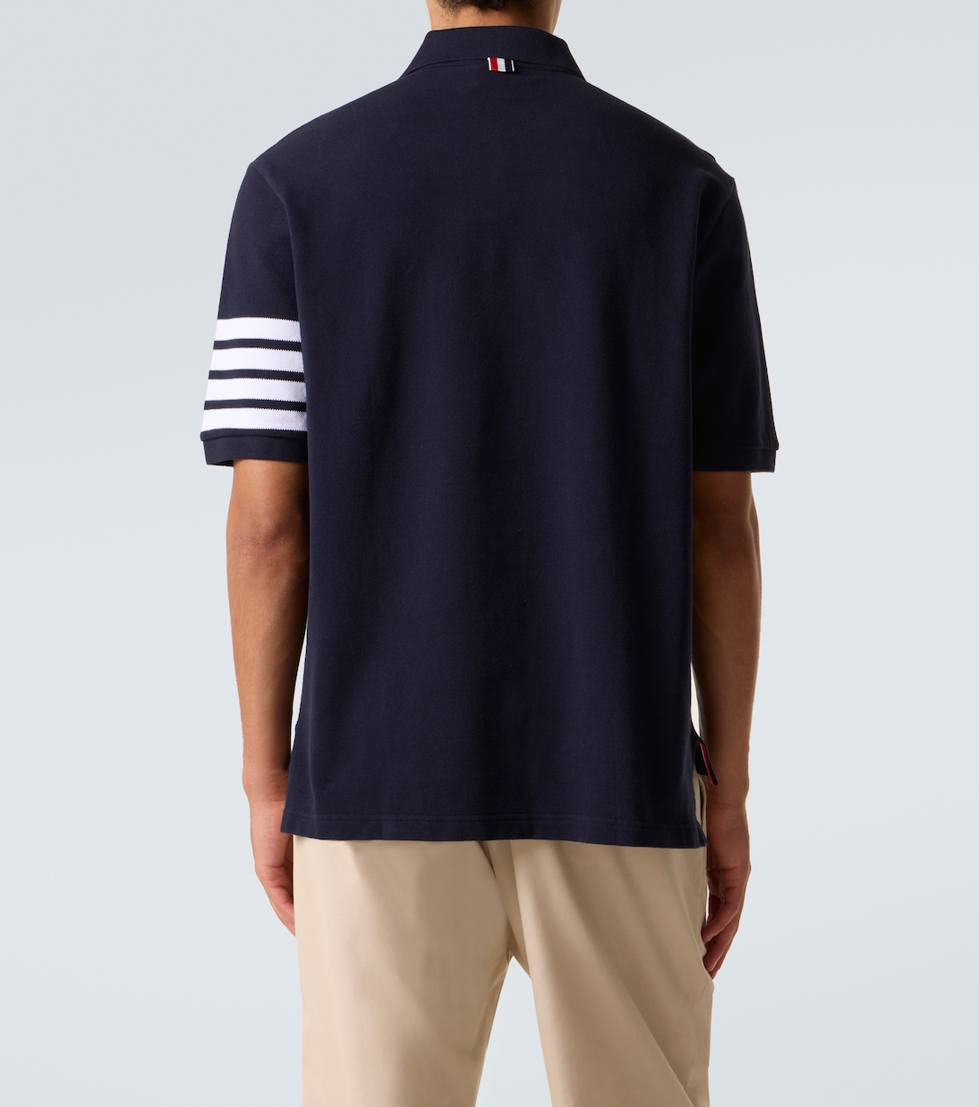 Контрастные горизонтальные полосы в виде четырех полос являются фирменным стилем Thom Browne, который называет дизайн бренда современной униформой. Эта рубашка поло изготовлена из хлопка и украшена культовым мотивом на левом рукаве.
