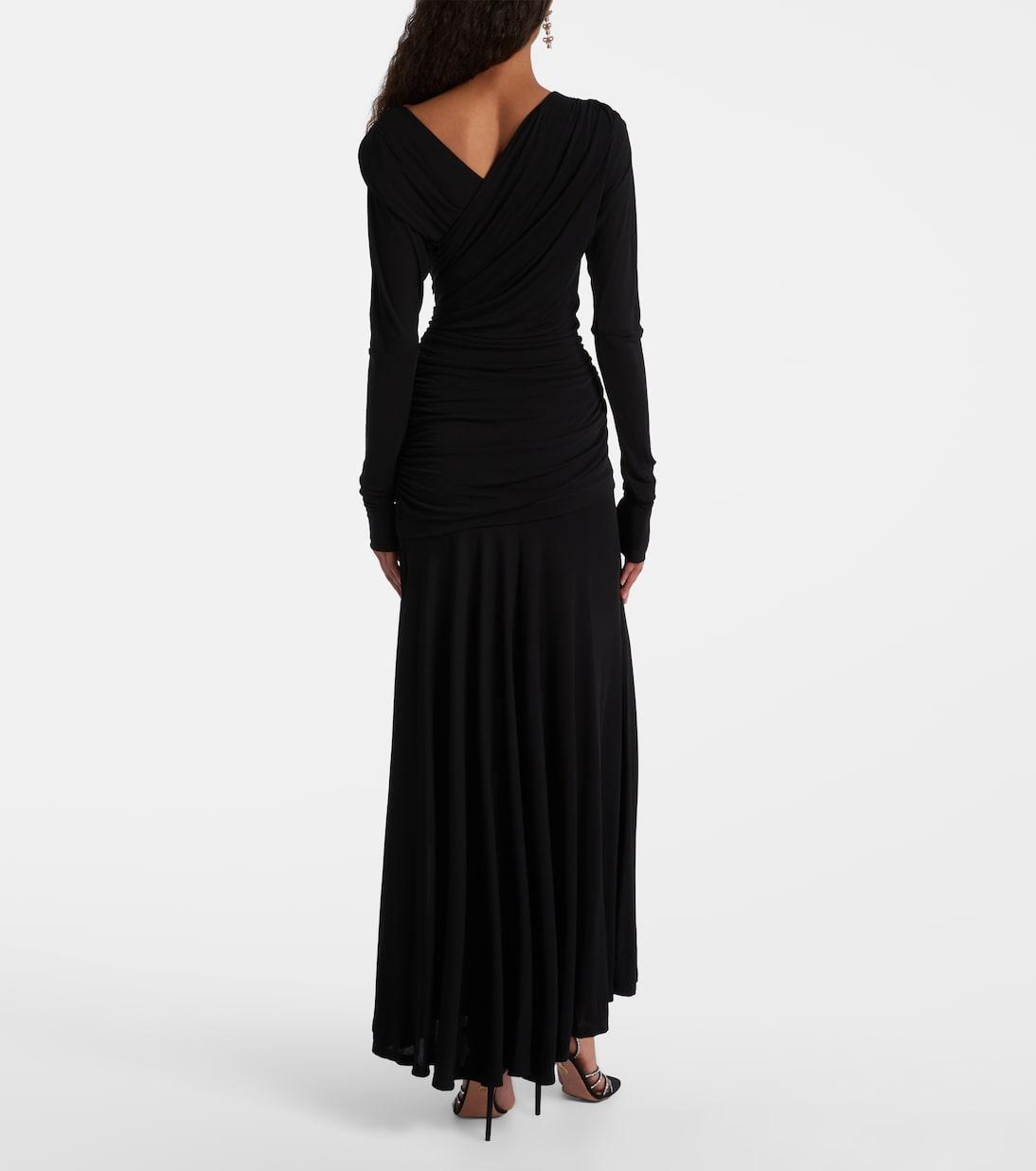 Копенгагенский бренд Ganni переосмысливает понятие скандинавского стиля благодаря своему причудливому и игривому подходу к дизайну. Это изысканное макси-платье с рюшами вдоль лифа, асимметричным драпированным вырезом и длинными рукавами.