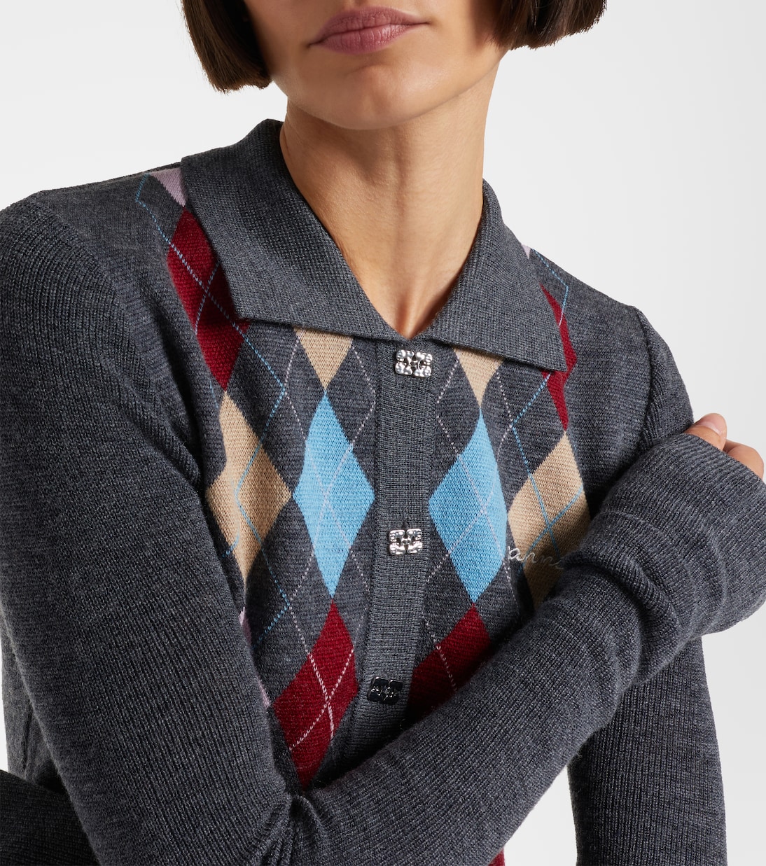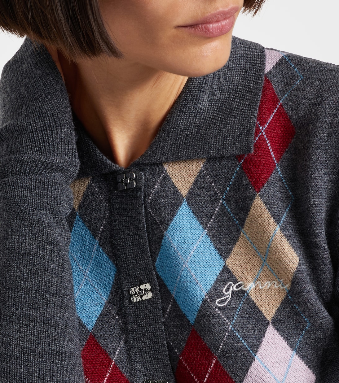 Копенгагенский бренд Ganni переосмысливает понятие скандинавского стиля благодаря своему причудливому и игривому подходу к дизайну. Этот свитер-поло, выполненный из шерсти, украшен ромбовидным узором и фирменными пуговицами-бабочками.