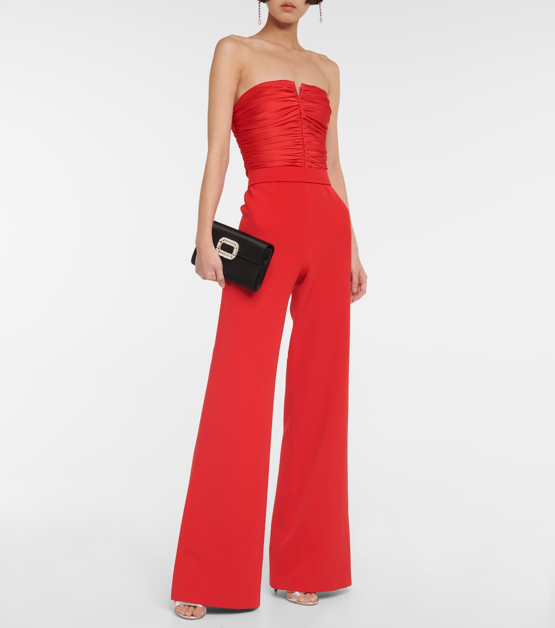 Красный комбинезон Miriana от Safiyaa имеет безрукавный лиф с рюшами, присборенную талию и широкие штанины, что создает выразительный силуэт.