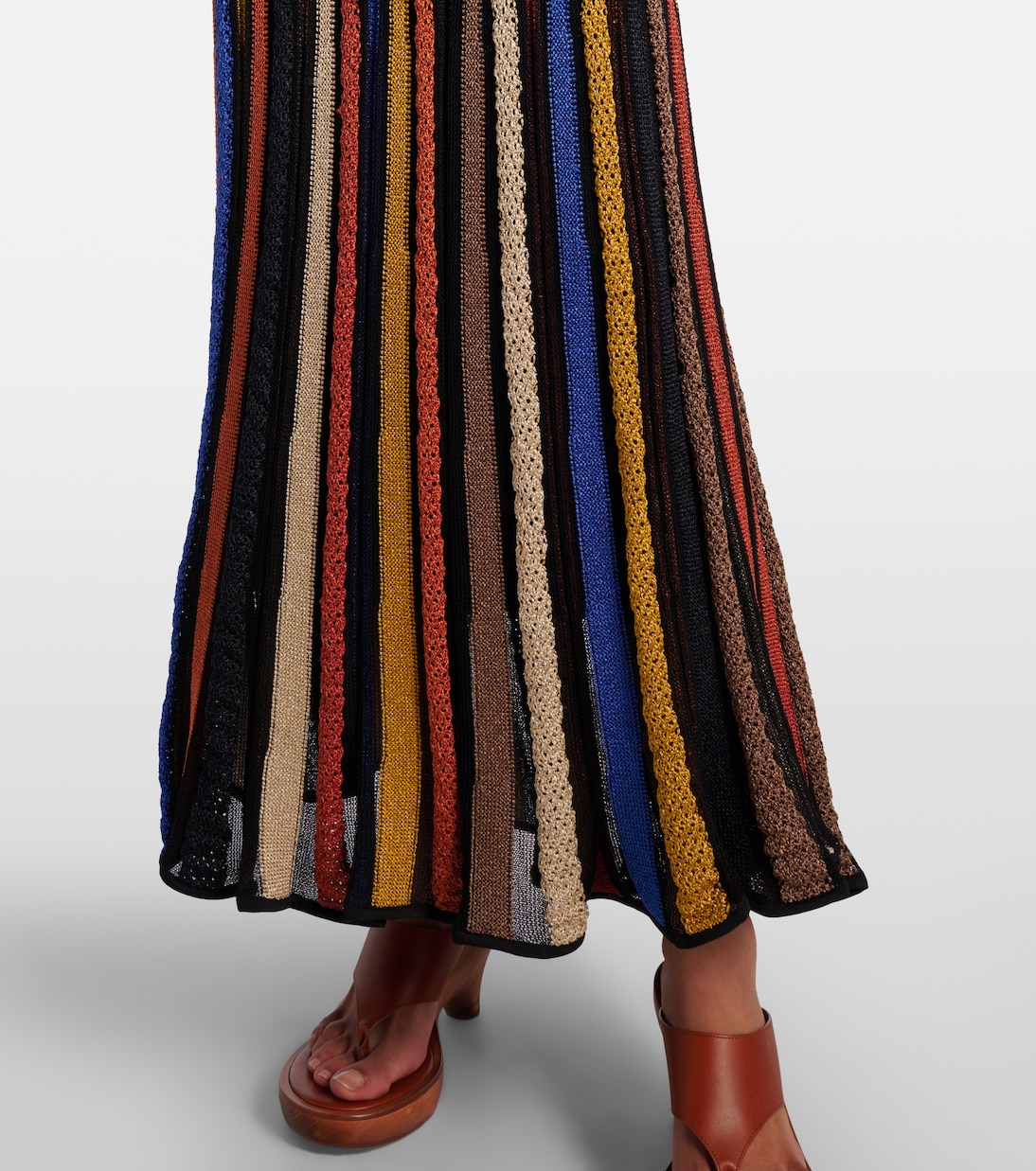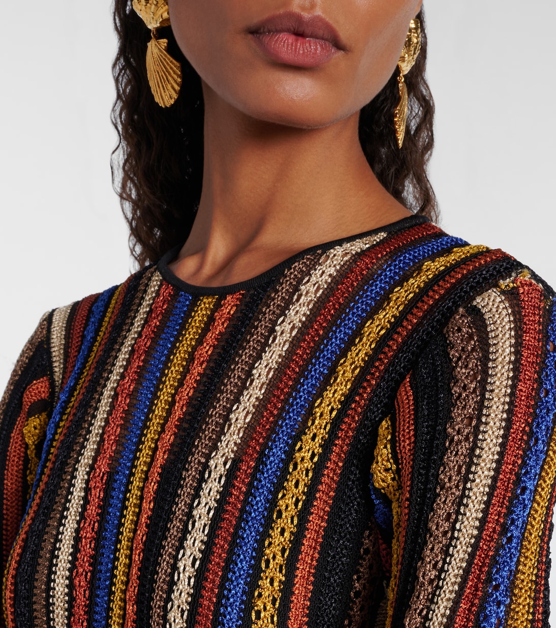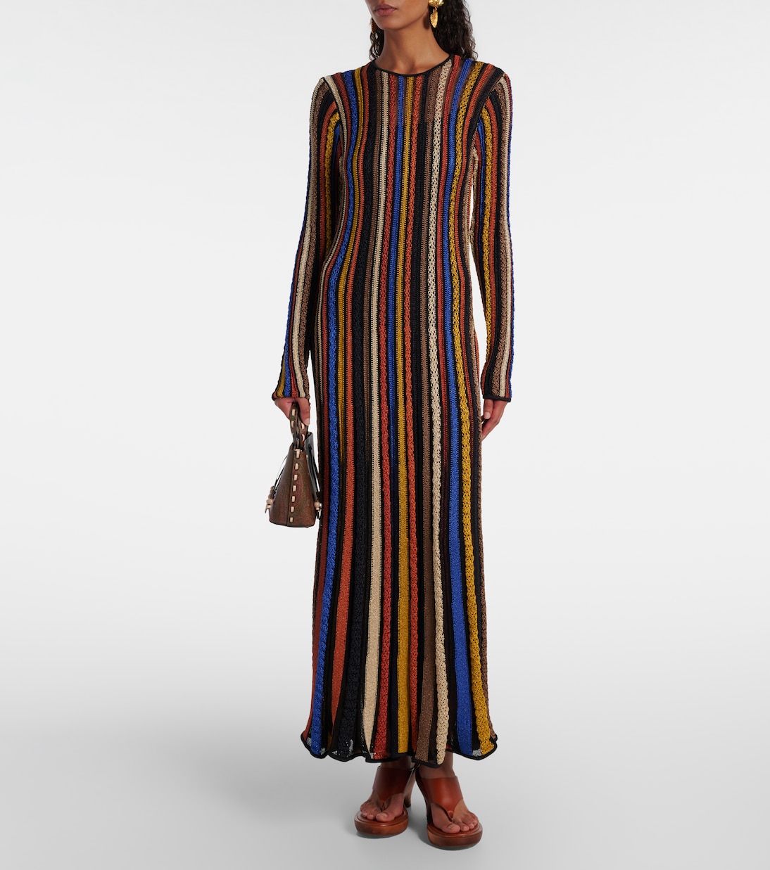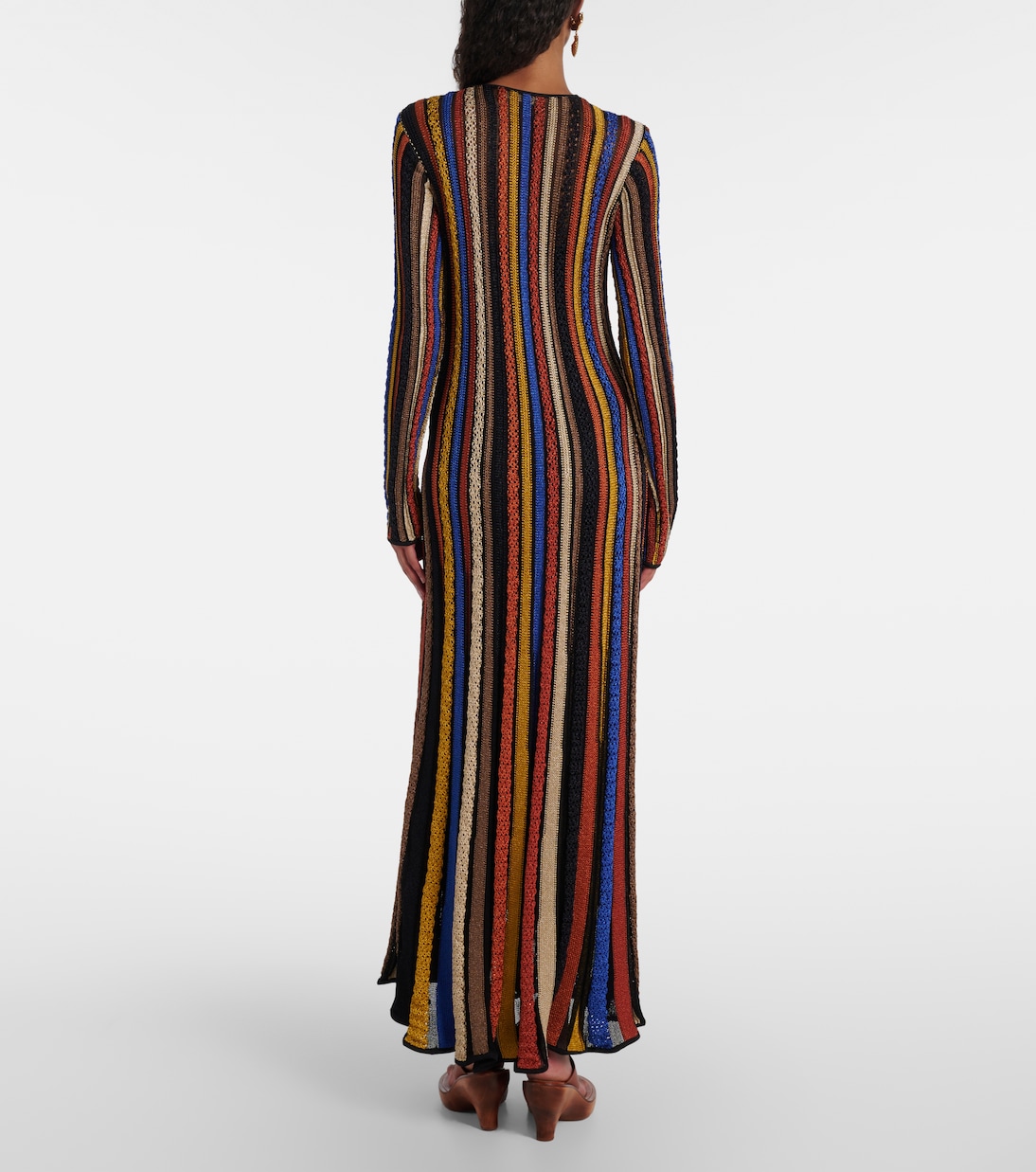 Красочное и элегантное макси-платье Albie от Ulla Johnson станет идеальным выбором для гламурных случаев. Это изделие из ламе, связанное в облегающий силуэт, украшено полосатым узором ярких оттенков по всей поверхности.