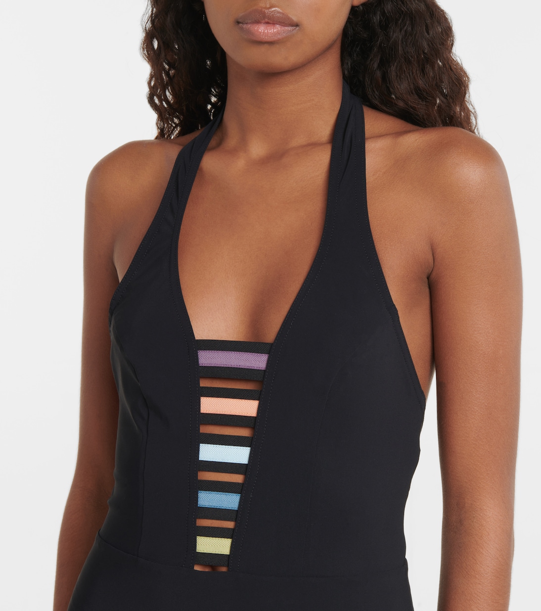 Купальник Karla Colletto Beatrix с яркими бретельками и глубоким V-образным вырезом, подчеркивающим фигуру. Этот фасон с завязкой на шее обеспечивает минимальную застежку.