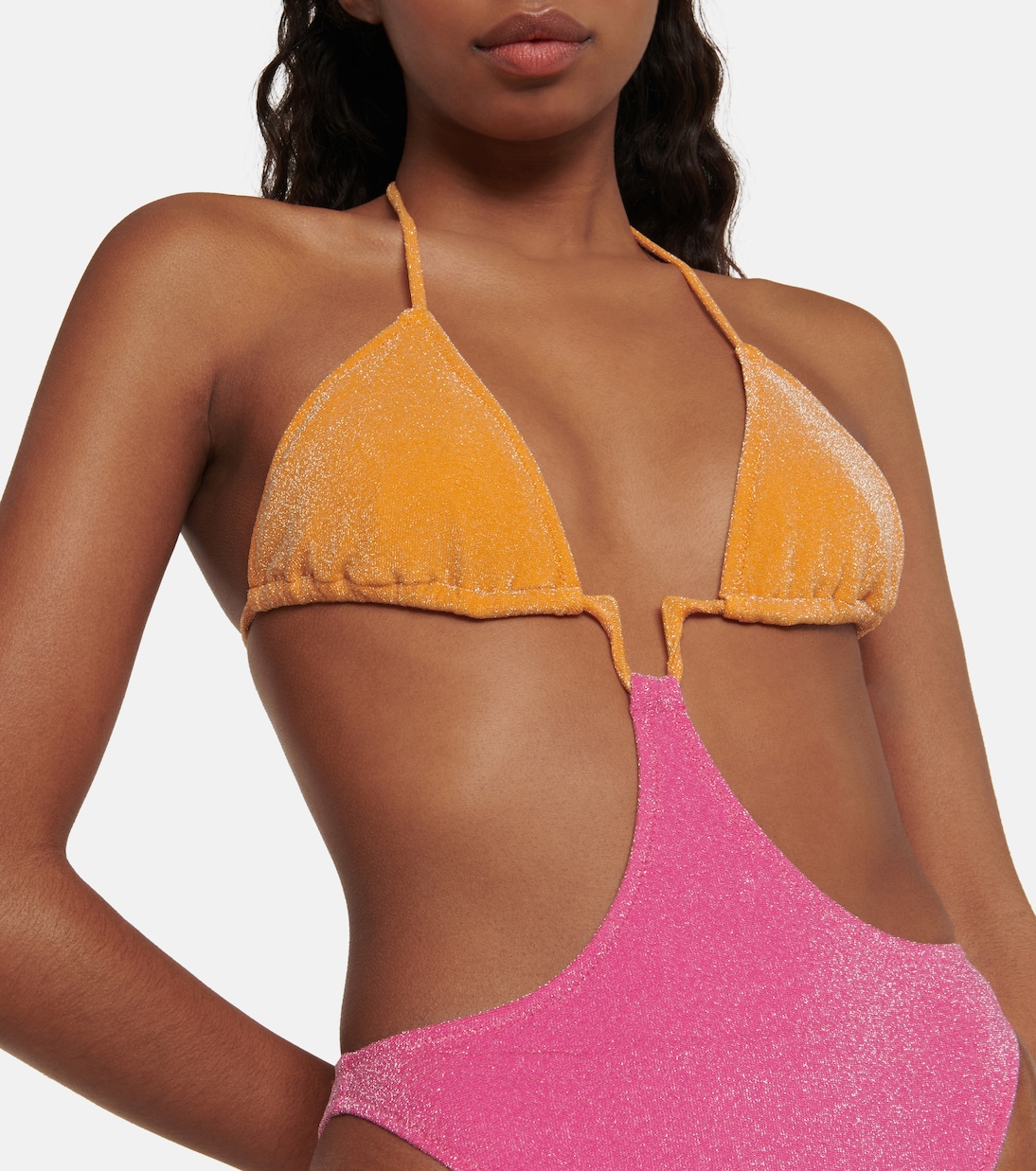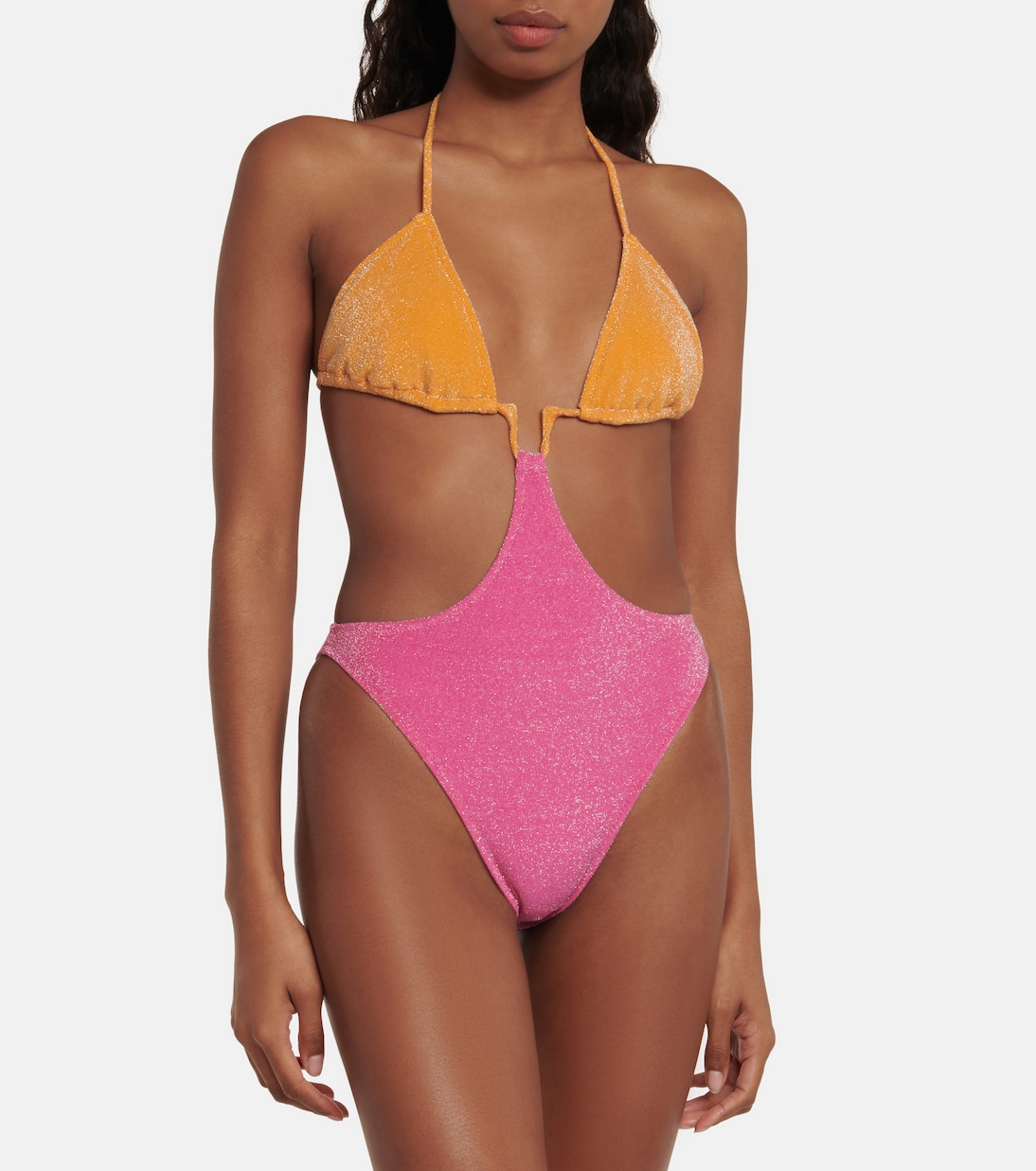 Купальник Mellany от Bananhot с американской проймой, U-образным вырезом и вырезами по бокам. Модель выполнена в оранжево-розовой цветовой гамме и обеспечивает минимальную закрытие.