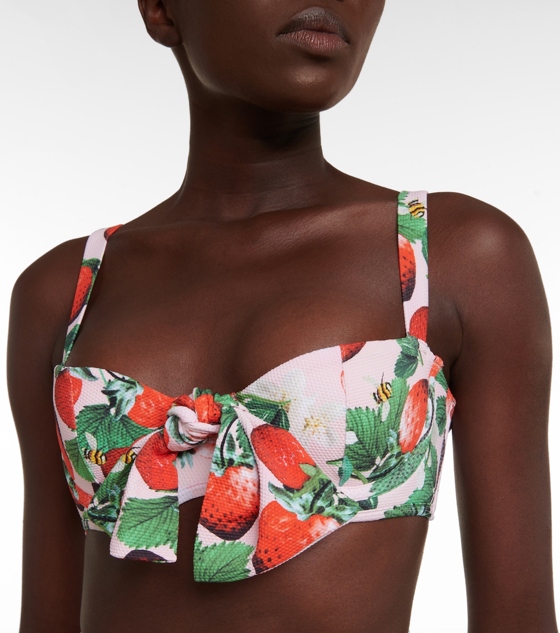 Лифчик-бикини Clara от Александры Миро имеет чашечки на косточках и широкие регулируемые бретели. Дизайн с ягодным принтом дополнен крупным бантом.