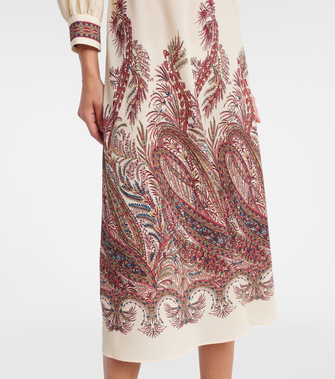 Любовь Джероламо и Роберты Этро к старинным принтам и узорам и сегодня остается краеугольным камнем итальянского бренда. Это платье-рубашка украшено нежным узором пейсли и имеет силуэт миди с застежкой на пол-пуговицы.