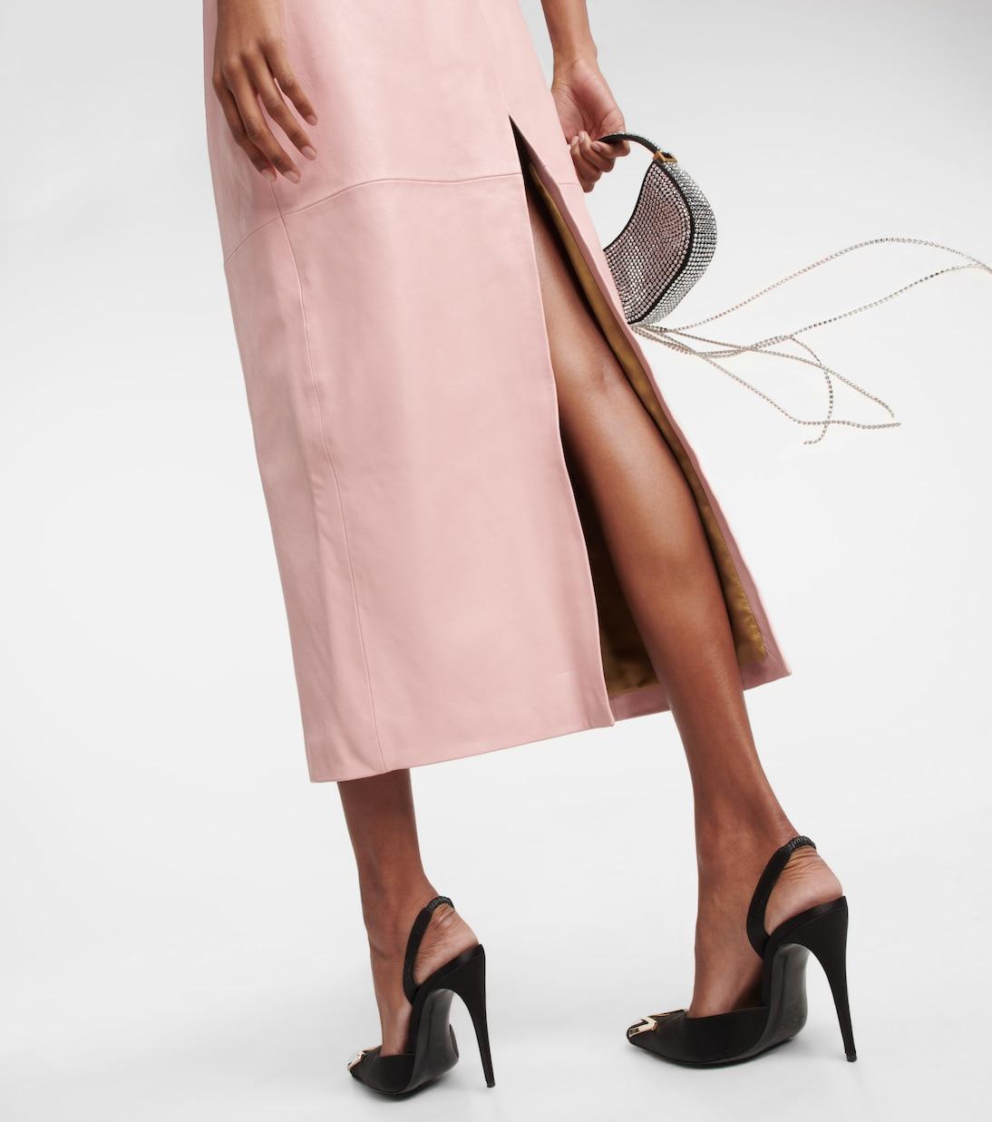 Магда Бутрим обновляет фирменное платье-бюстье с корсетом миди, представив версию из кожи розового цвета. Модель имеет округлые чашки в ретро-стиле, плотный лиф и облегающую юбку.