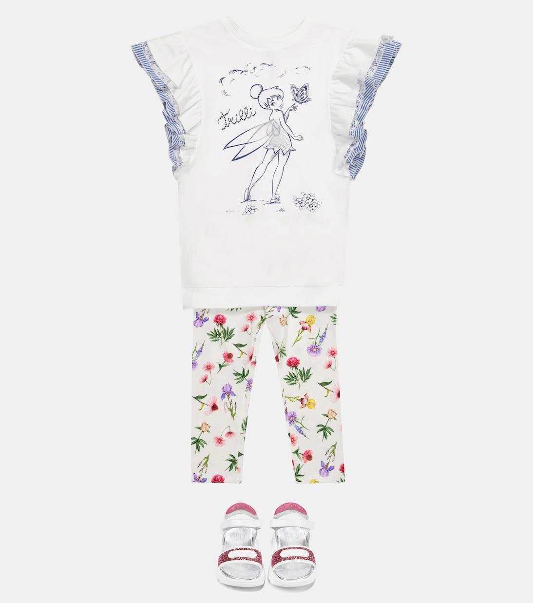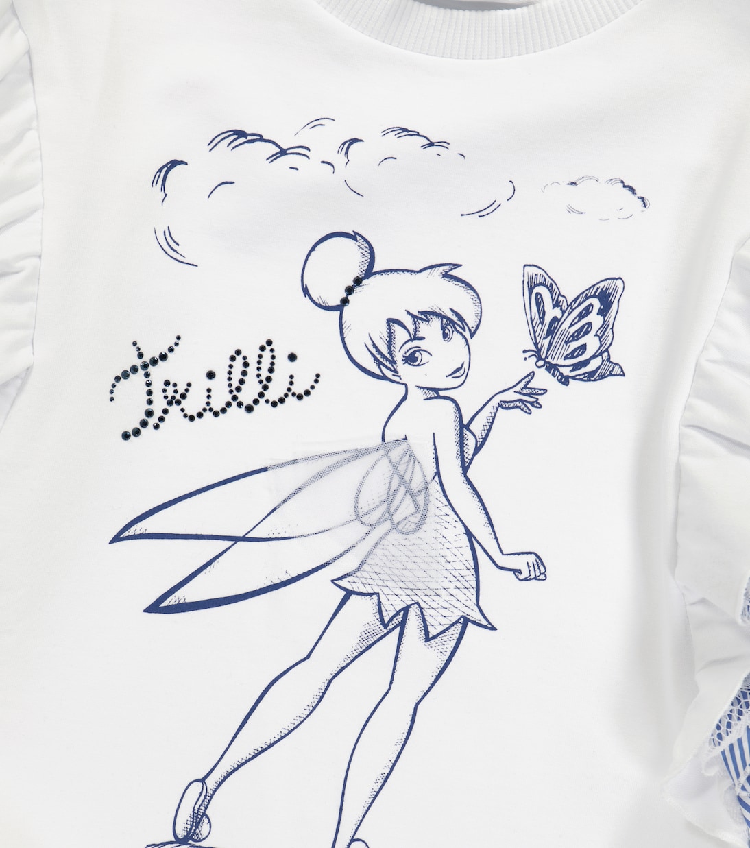 Маленькие личики загорятся, увидев, кто украшает это платье-свитшот от Monnalisa. Платье выполнено из белого эластичного хлопкового трикотажа для комфорта и дополнено очаровательными многоярусными оборками на рукавах, которые, на наш взгляд, идеально имитируют крылья диснеевской феи Динь-Динь.