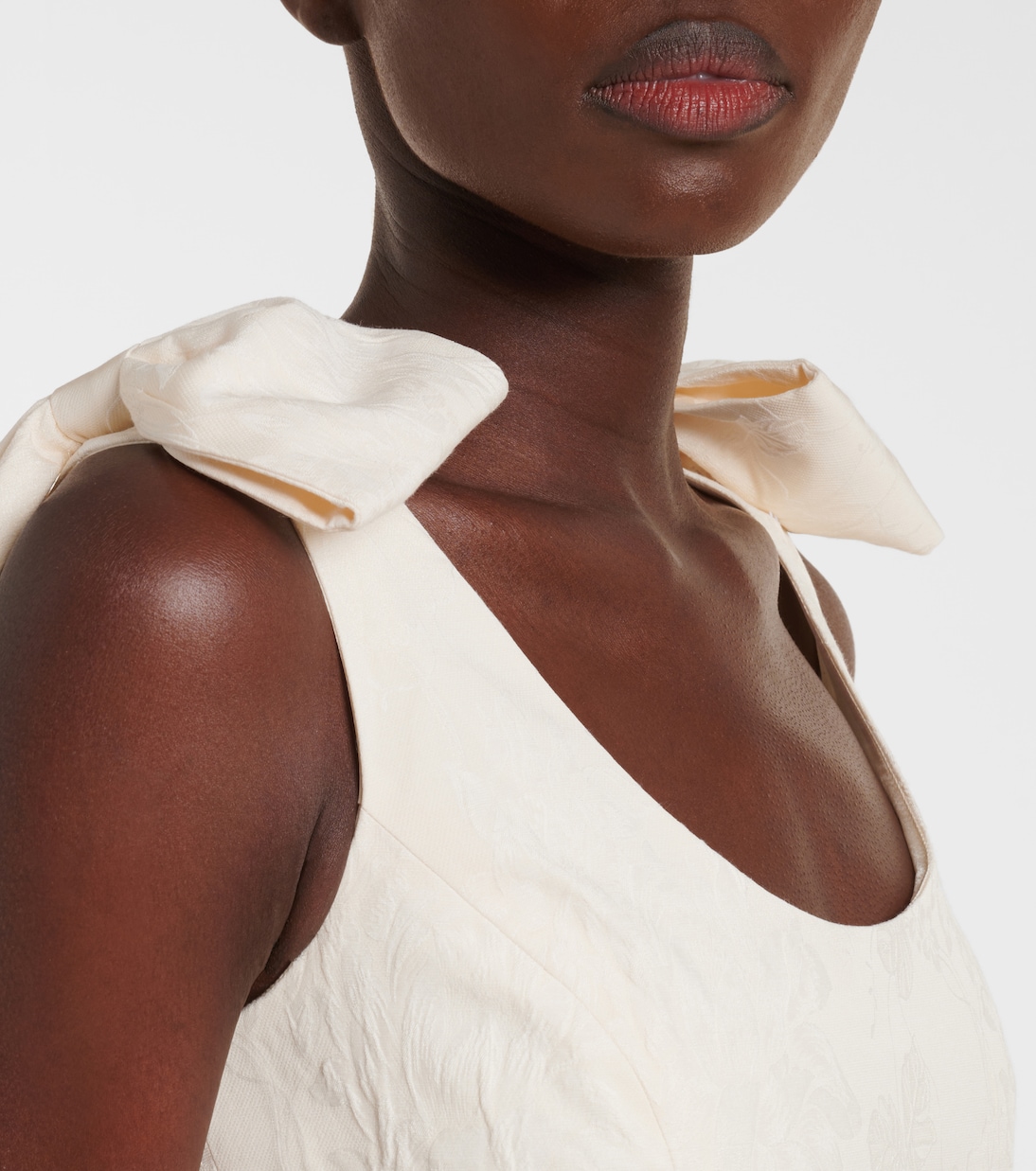 Мини-платье Gita от Markarian, выполненное из тонкой парчи, отличается минималистичным дизайном, дополненным объемными бантами на бретелях и большими лентами, ниспадающими на спину.