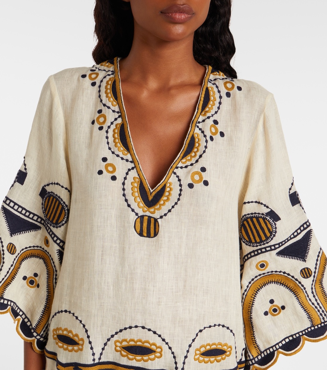 Мини-платье Medaillon от Eres имеет V-образный вырез, украшенный замысловатой вышивкой по вырезу, рукавам и подолу. Изделие выполнено из воздушного льна и дополнено расклешенными рукавами с фестончатым краем и незаметными боковыми карманами.