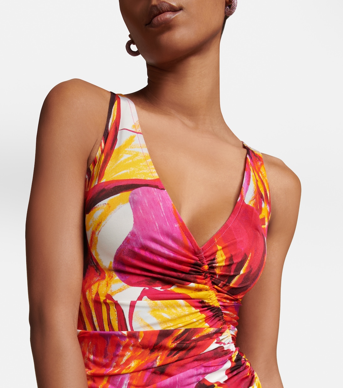 Мини-платье Summer Solstice от Louisa Ballou выполнено из эластичного трикотажа с фирменным принтом бренда Рыцарский тур. Модель имеет элегантный V-образный вырез и асимметричный перед с рюшами.