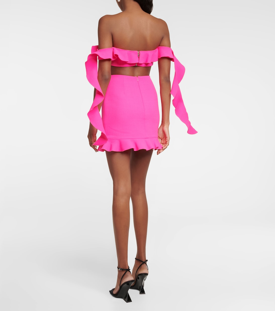 Мини-юбка Дэвида Комы неоново-розового цвета гарантированно ослепит вас на вашем следующем вечернем мероприятии. Облегающий фасон из шерстяной смеси, с высокой посадкой на талии и игривым оборчатым подолом.