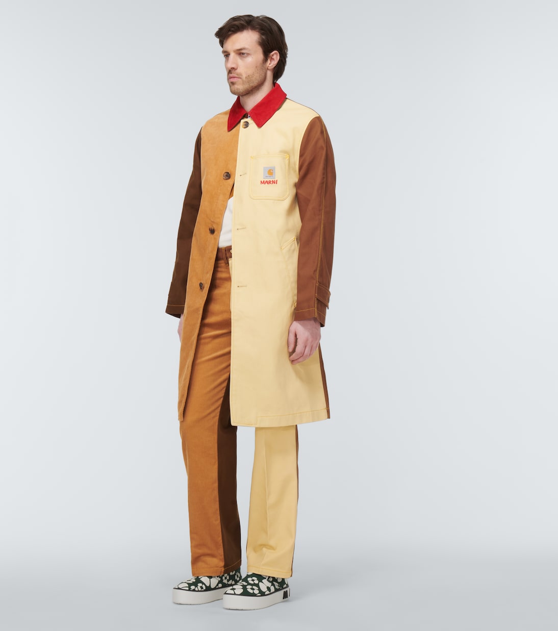 Мир ярких красок Marni объединяется с пионером в производстве рабочей одежды Carhartt для создания необычной утилитарной коллекции, такой как эти брюки. Прямой крой с цветовыми блоками по всей поверхности и контрастной вельветовой штаниной, дополненной застежкой на пуговицы в форме сердца.
