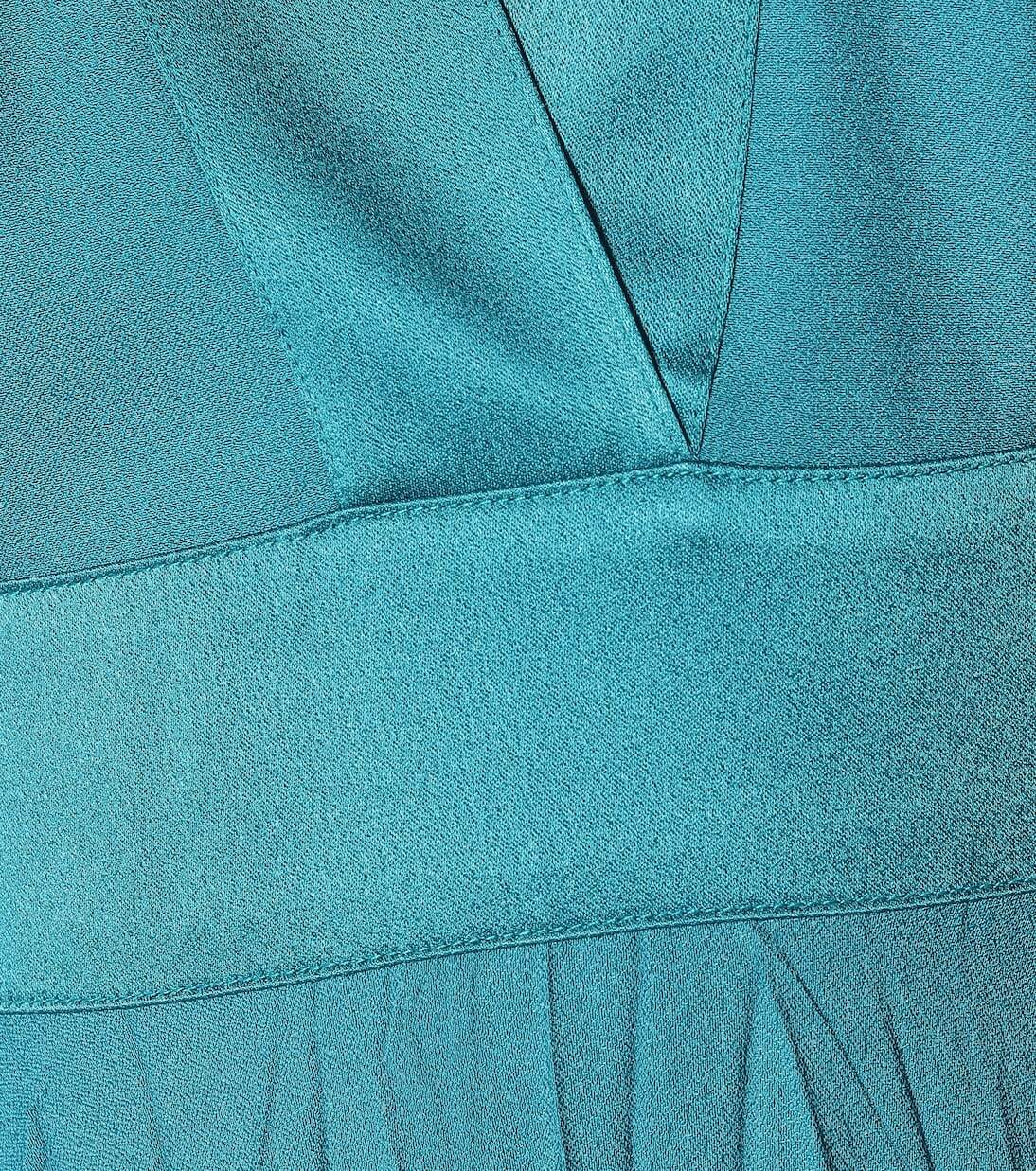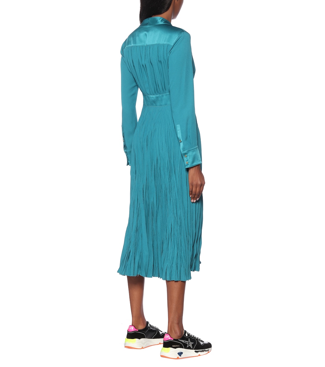Наденьте свой образ в стиле Dynasty с бирюзовым платьем Adriana от Golden Goose. Платье с V-образным вырезом, выполненное из жатой ткани средней плотности с атласной отделкой, воплощает гламурный максимализм 80-х. Приталенный на талии, он образует силуэт песочные часы, который будет выглядеть божественно с тональными туфлями на блочном каблуке.
