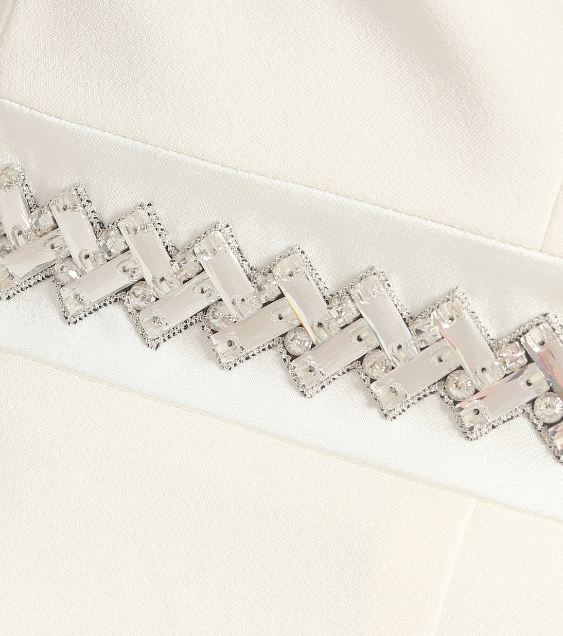 Невесты, предпочитающие минималистичный и максималистский стиль, оценят атласное креповое платье Shenice цвета слоновой кости от Safiyaa. Платье повторяет контуры тела в силуэте рыбий хвост во всю длину, имеет элегантный высокий ворот и открытую спину, обрамленную украшениями из кристаллов в елочку.