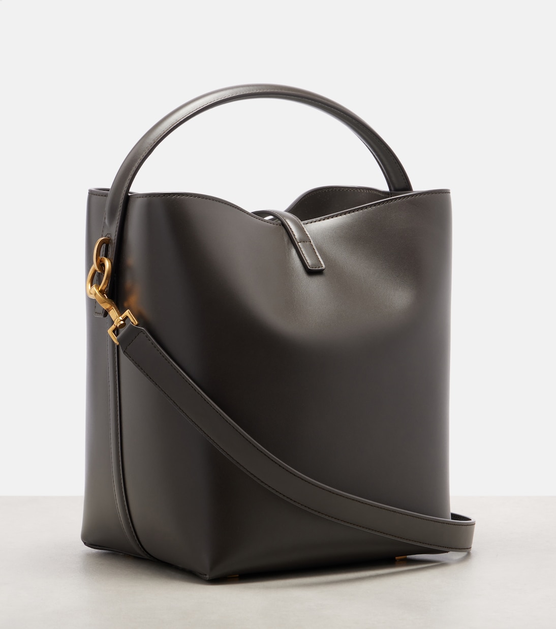 Один из самых известных символов в моде, монограмма YSL состоит из переплетенных инициалов основателя Saint Laurent. Здесь золотистого оттенка это пряжка кожаной сумки-ведра Le 37 Cassandre.