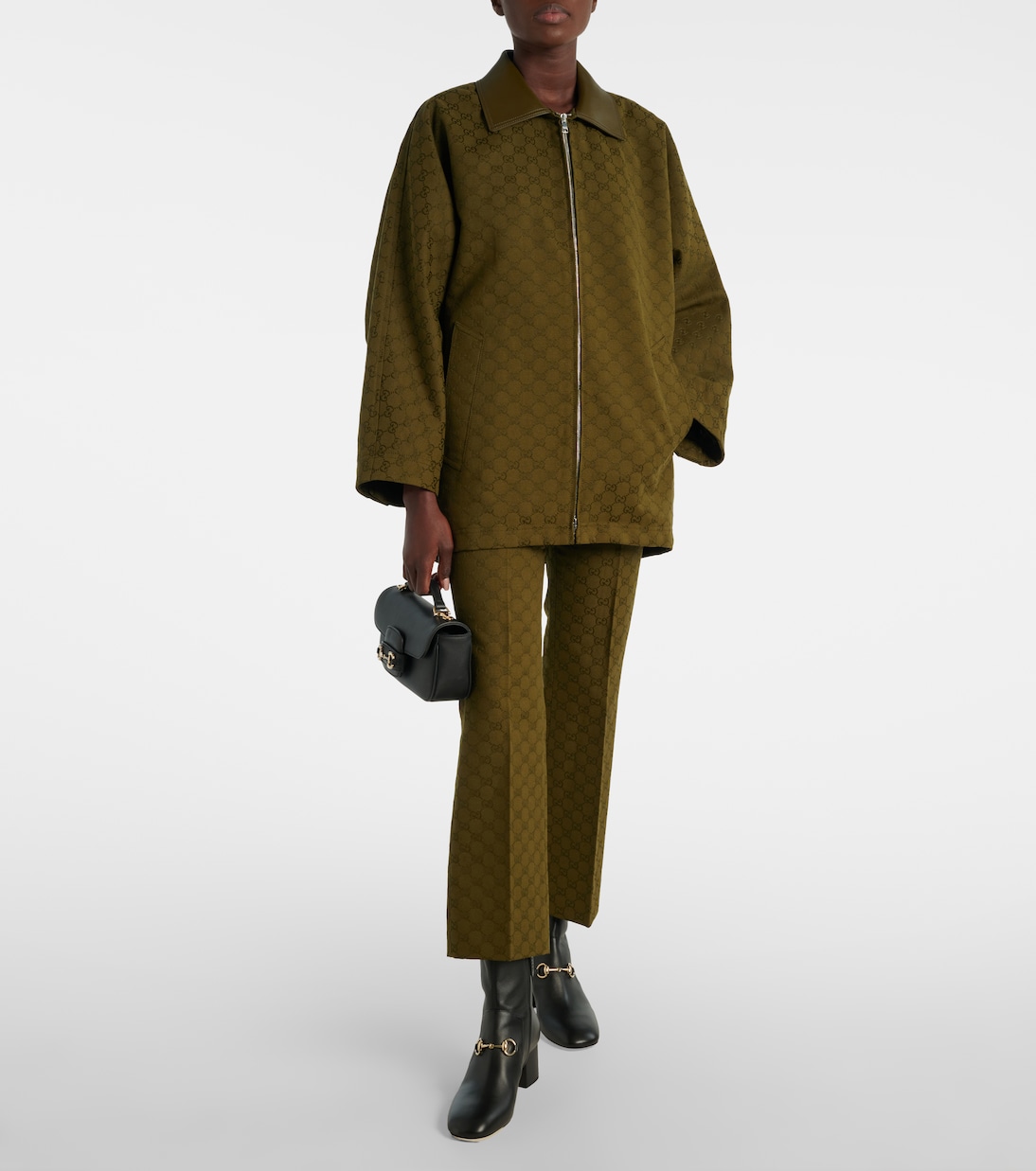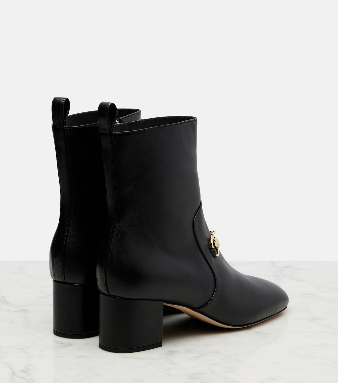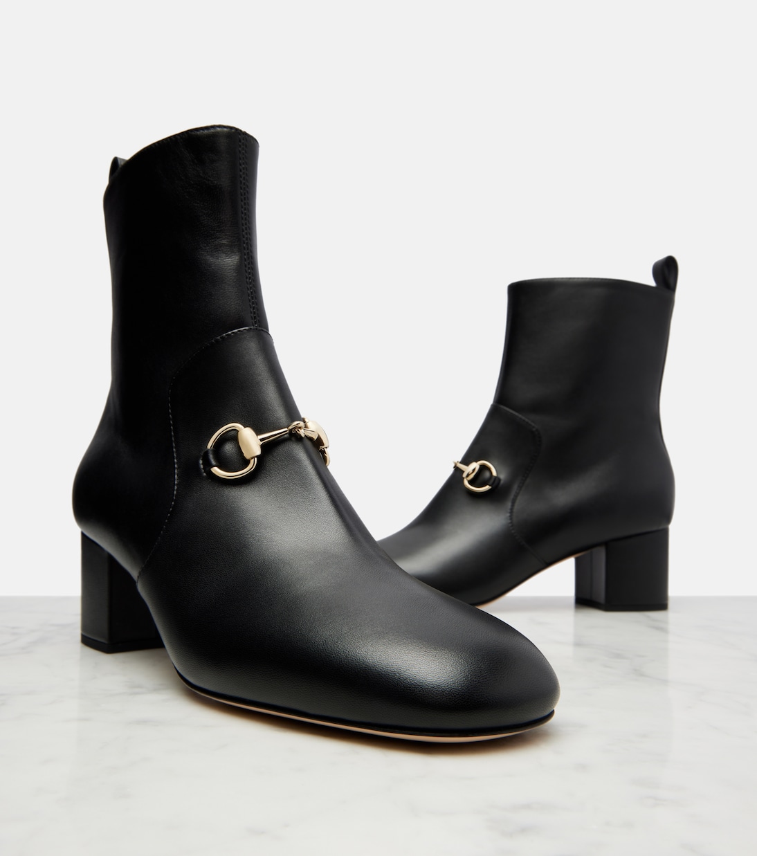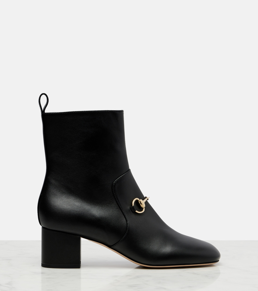 Один из самых ярких символов Gucci, Horsebit, указывает на давнюю любовь дома к конному дизайну. Представлено на кожаных ботильонах Horsebit, дизайн дополнен молнией сбоку.