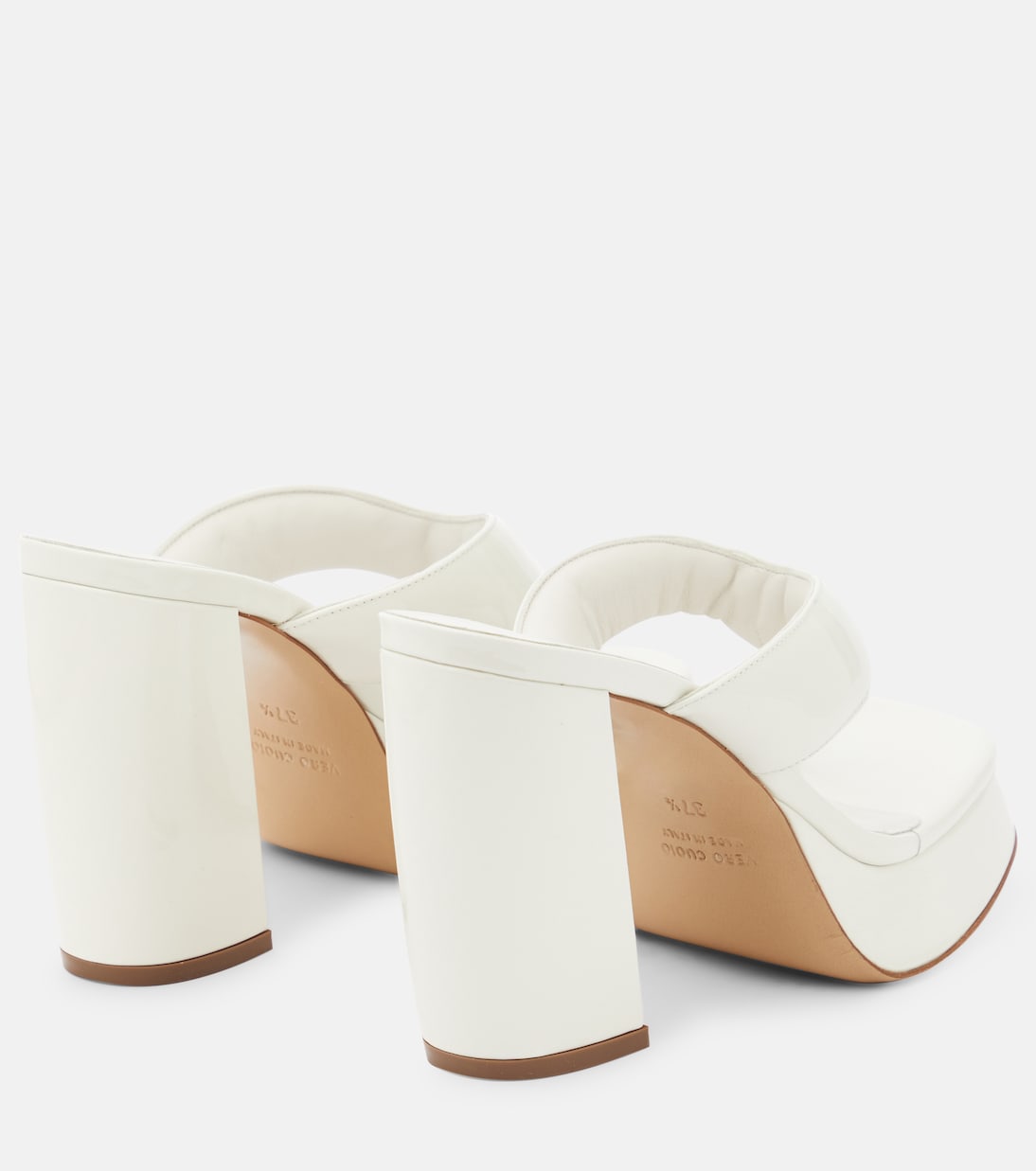 Ознакомьтесь с современным видением обуви от Джии Боргини. Эта модель, выполненная из глянцевой лакированной телячьей кожи, имеет перемычки для пальцев с широкими ремешками на союзке, платформу и толстый блочный каблук.