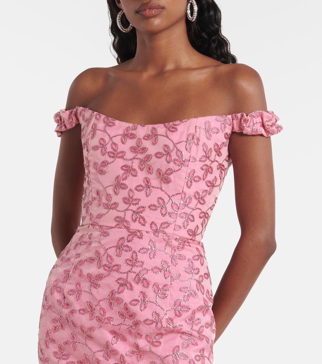 Особые события требуют очаровательных моделей, таких как платье миди Amina от Markarian. Его дизайн выделяется своим цветочным узором из блесток и имеет вырез с открытыми плечами, дополненный эластичными бретелями.