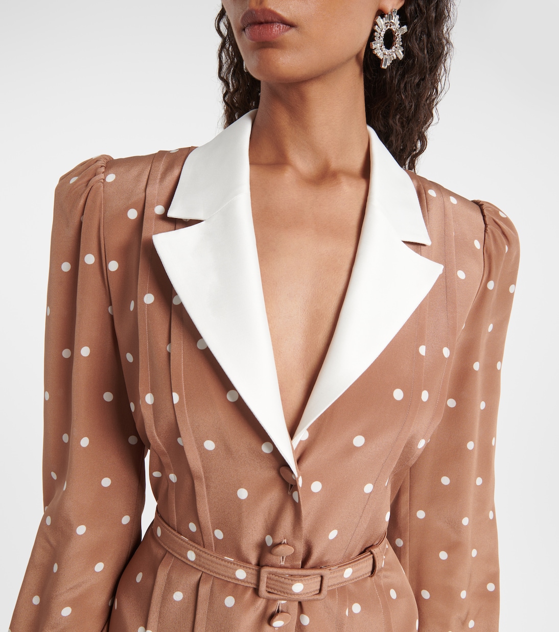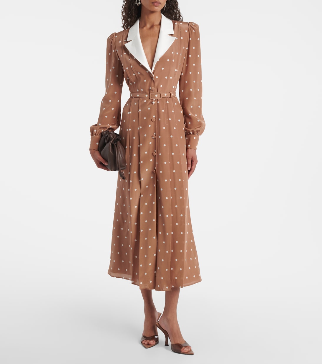 Оставьте свой выбор на Алессандре Рич, которая приковывает к себе всеобщее внимание и дарит женственные образы, как, например, это платье-рубашка. Блестящая драпировка из коричневого шелка с узором в горошек создает изделие со структурированными плечами и контрастным острым воротником, подчеркивающим силуэт.
