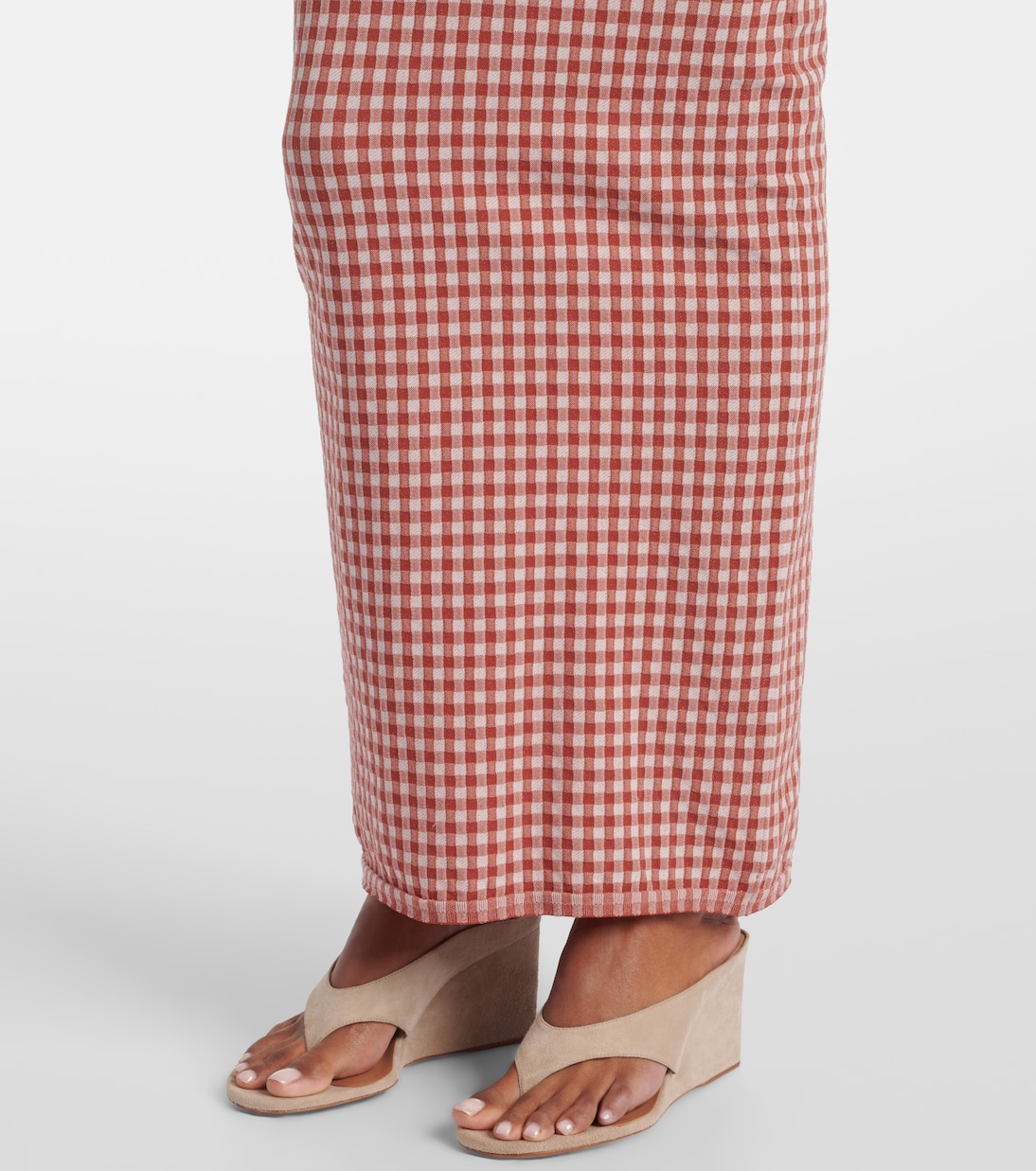 Отдавая дань уважения наследию Аззедина Алайи, скульптурные и в то же время носибельные коллекции дома моды обладают искусным балансом, которого под силу достичь только самым искусным дизайнерам. Это макси-платье в клетку виши с вырезом на плечах, скроенное так, чтобы оно облегало и подчеркивало фигуру.