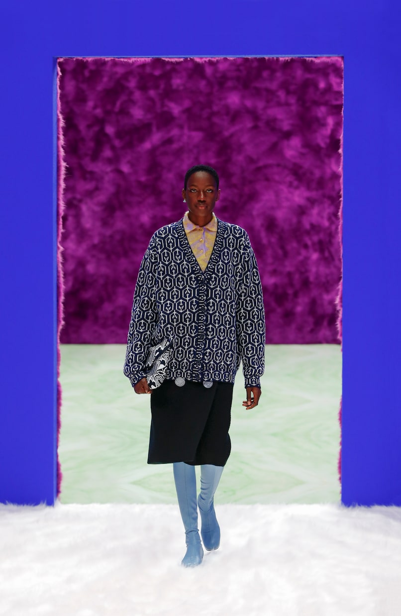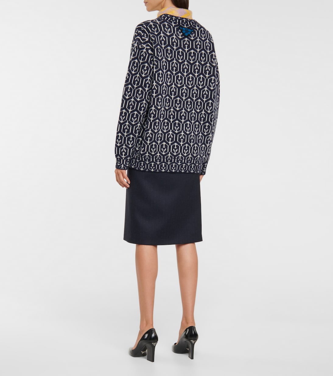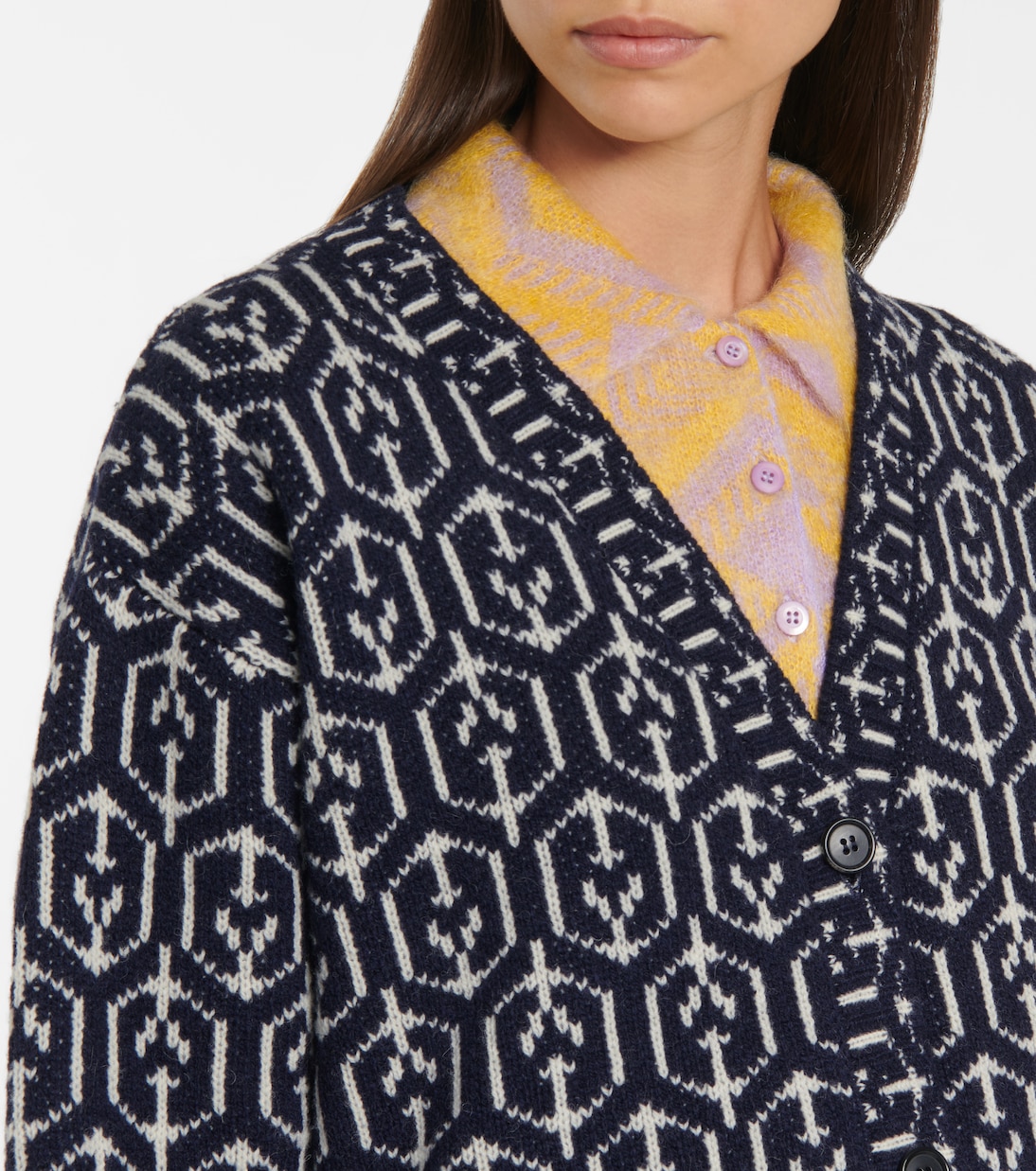 Отдайте предпочтение эффектному трикотажу - этому кардигану жаккардовой вязки с геометрическим узором от Prada. Изготовлено из мягкой шерсти с отделкой под черепаховый панцирь и застегивается на пуговицы спереди.