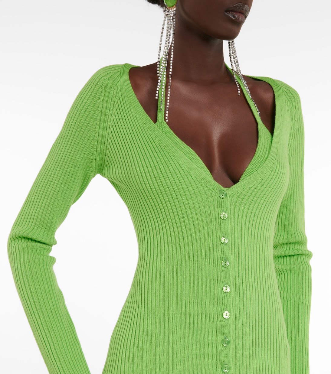 Ощутите гламур 2000 года с женственными моделями Blumarine. Это платье в рубчик, выполненное из пряжи натуральной шерсти зеленого цвета, имеет облегающий крой, застежку на пуговицы спереди и очень глубокий вырез, который подчеркивает соответствующий трикотажный бюстгальтер.