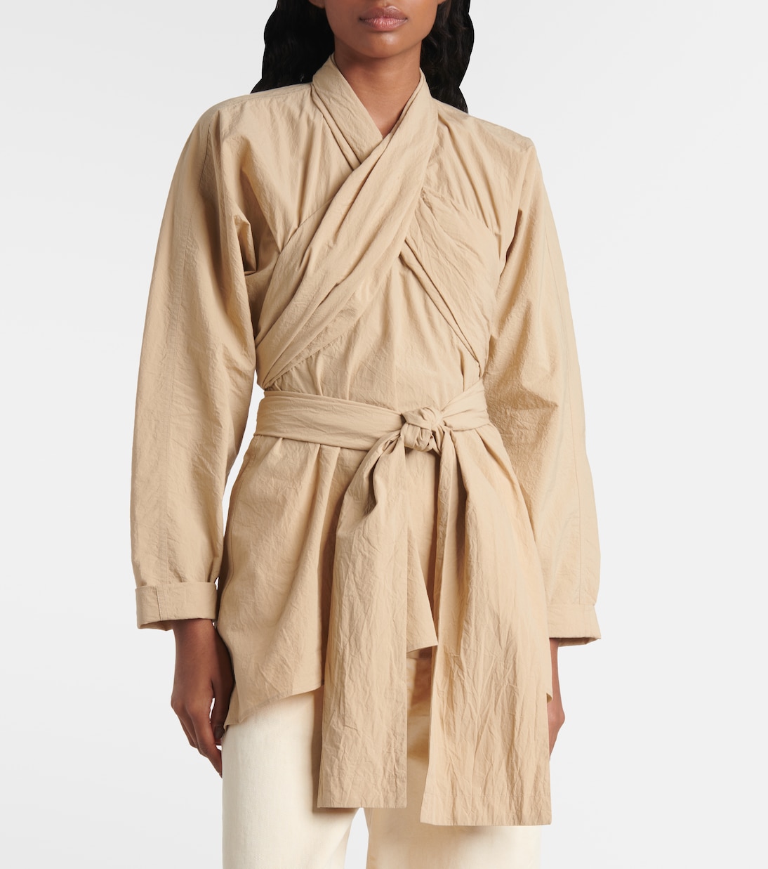 Ощутите изысканность Lemaire с этим обволакивающим топом. Изготовлено из хлопка с жатой отделкой, имеет перекрещивающиеся детали на груди и завязывающийся пояс для утягивания талии.