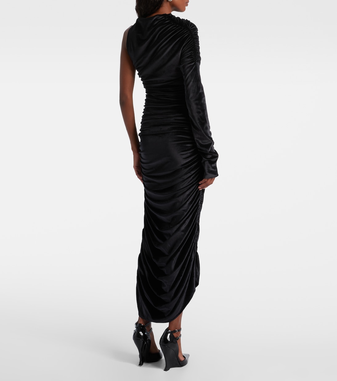 Парижский дом моды Mugler, известный прежде всего своими скульптурными силуэтами, бросает вызов традиционному дизайну одежды. Это асимметричное платье из бархатного джерси с драпированным рюшами, одним длинным рукавом и подолом с разрезом.