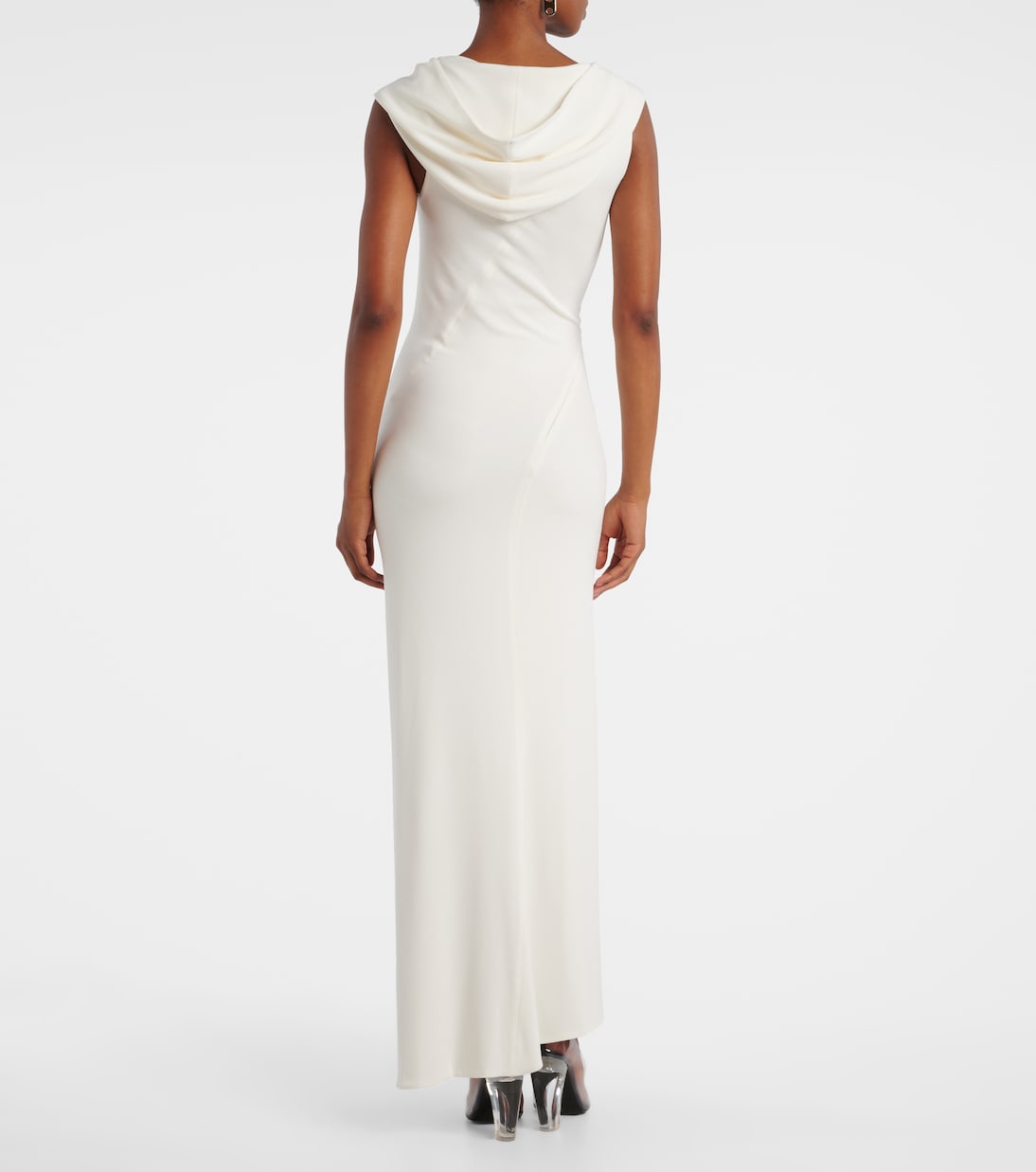 Парижский дом моды Mugler, известный прежде всего своими скульптурными силуэтами, бросает вызов традиционному дизайну одежды. Это изысканное платье с капюшоном выполнено из струящегося трикотажа и имеет асимметричный вырез и боковой разрез для дополнительной привлекательности.