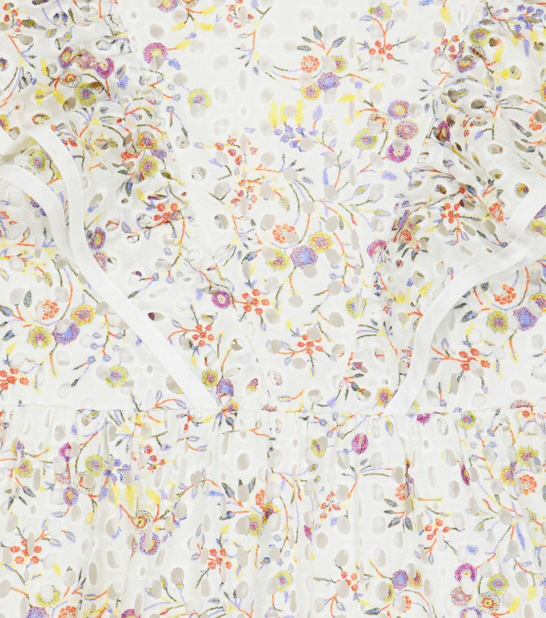 Платье Adele от Paade Mode - идеальное летнее праздничное платье для самых маленьких. Изготовлено из хлопковой ажурной вышивки бродери англез и украшено красочным цветочным мотивом, имеет оборки на рукавах и миди-низ.