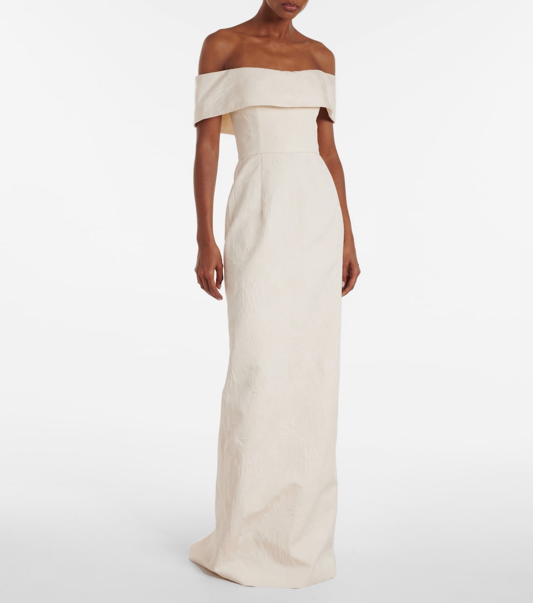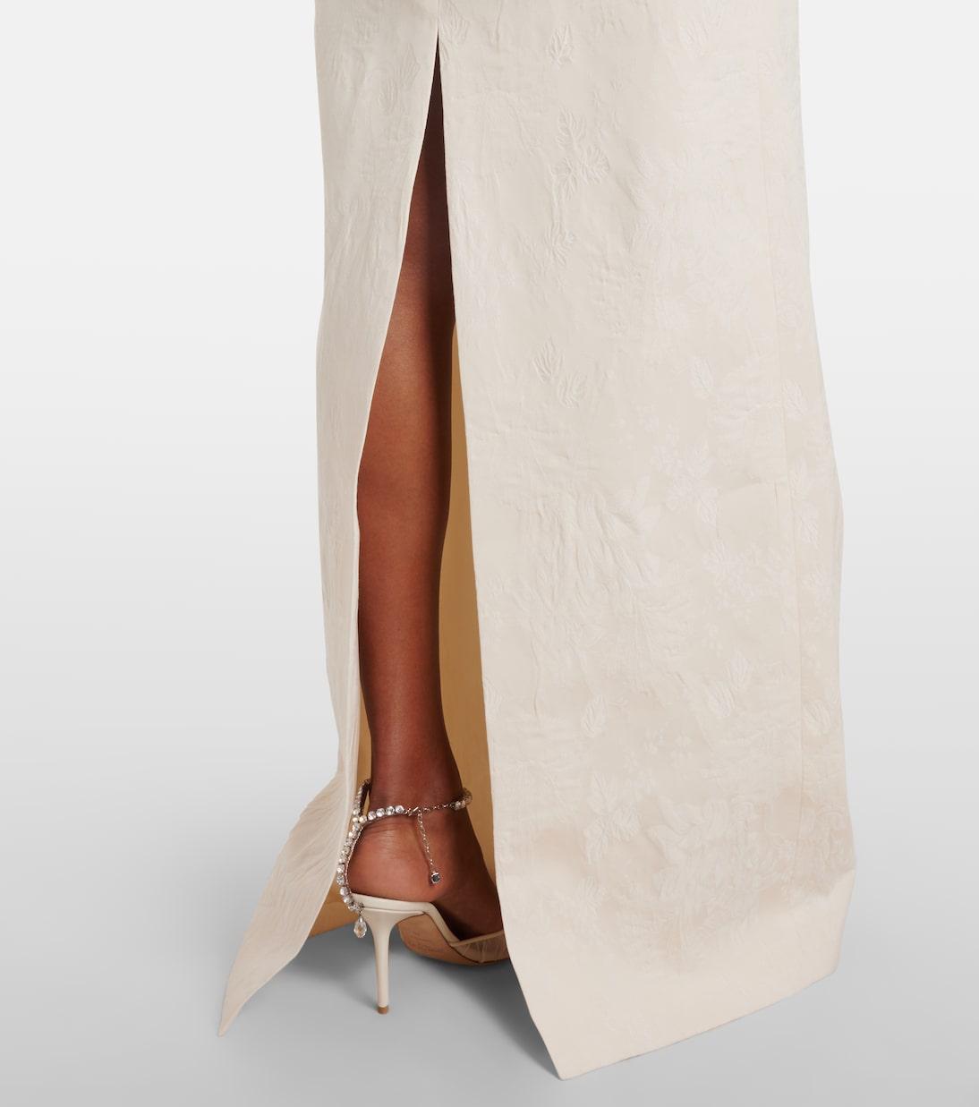 Платье Clover от Markarian - это вневременной дизайн, сшитый из цветочной парчи. Классический силуэт колонна характеризуется лифом в стиле корсета и подчеркивающим фигуру вырезом с открытыми плечами.
