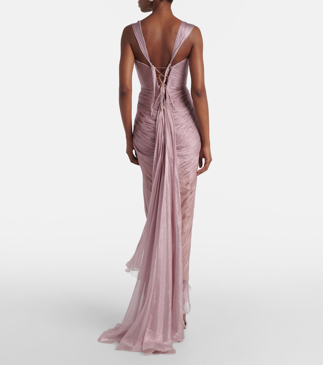 Платье Corinna от Maria Lucia Hohan выполнено из тонкого плиссированного шелка и имеет лиф на косточках с элегантной перекрестной драпировкой. Этот воздушный дизайн дополнен шнуровкой сзади для индивидуальной посадки, подчеркивающей фигуру.