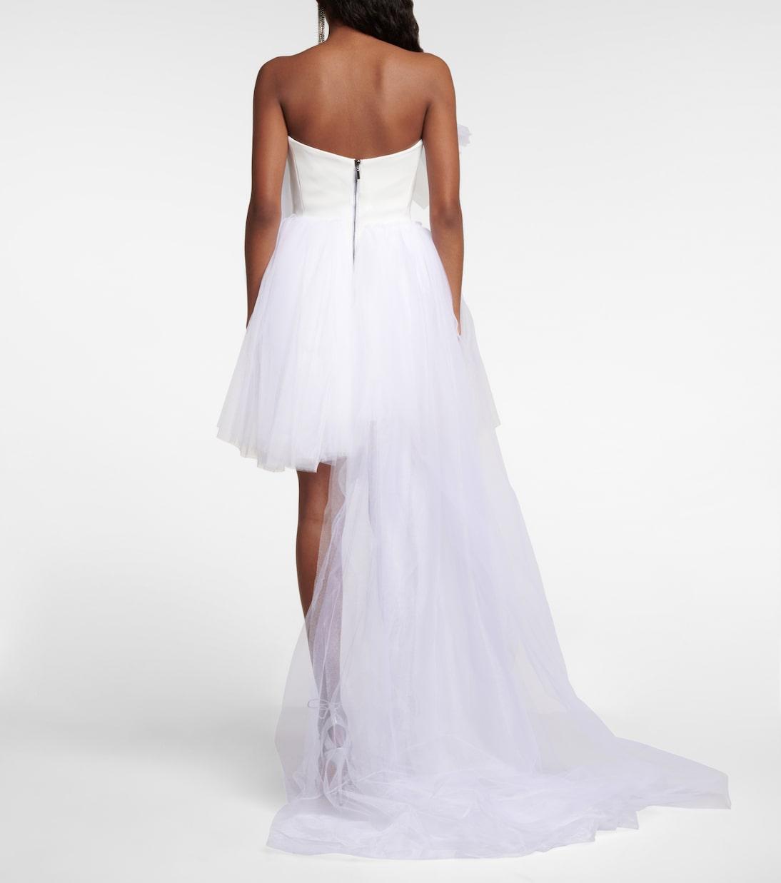 Платье Evermore от Maticevski выполнено в силуэте без бретелек с внутренними корсетными косточками. Лиф и талию обтянуты слоями тюля, которые ниспадают до романтичного шлейфа длиной до пола.