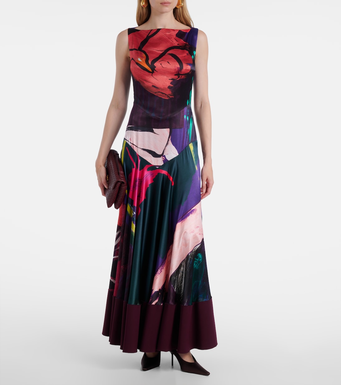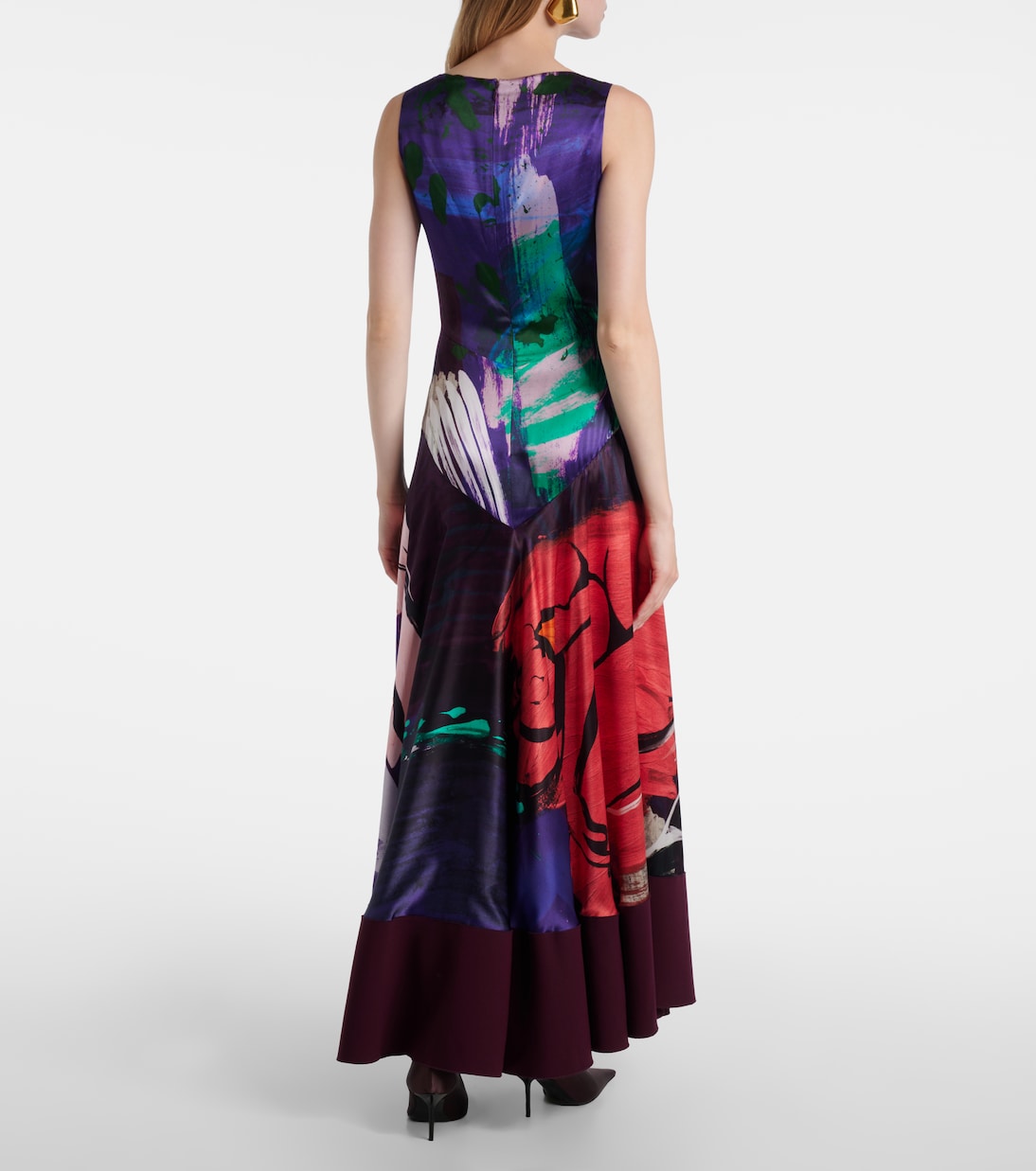 Платье Munir от Roksanda выполнено из блестящего шелкового атласа и украшено абстрактным принтом ярких оттенков. Этот очаровательный дизайн имеет заниженную талию и переходит в струящуюся юбку.