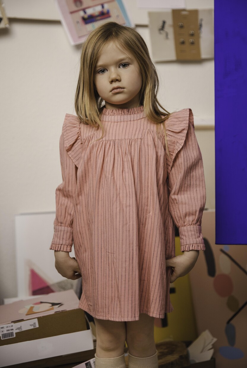 Платье Rookie Plana от Morley с оборками на плечах, воротнике и манжетах сделает вашего малыша по-настоящему очаровательным. Модель выполнена из смеси хлопка и шерсти розового цвета с черными полосками, спереди частично застегивается на пуговицы, а юбка струится.