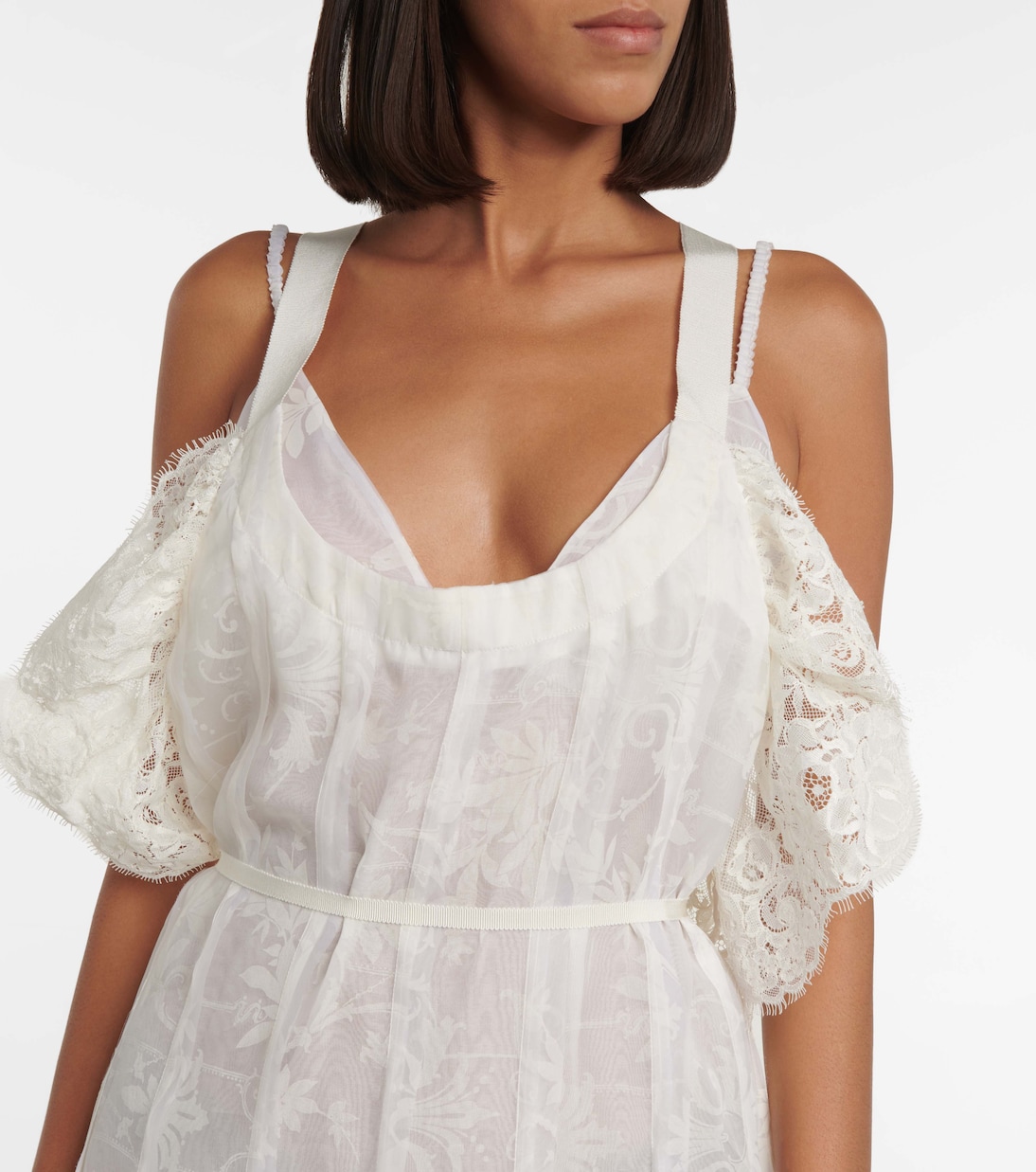 Платье макси Talayah от Brock Collection - это вдохновляющий вариант как для дневного, так и для вечернего времени. Изготовлено из бежевой смеси хлопка и шелка с цветочным принтом, имеет V-образный вырез, кружевную отделку и завязывающуюся талию.