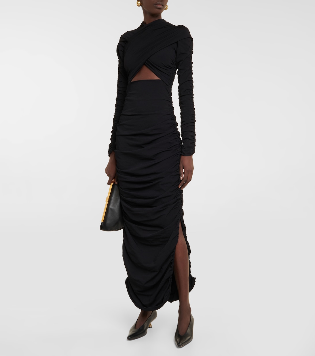 Платье макси Vienna от Khaite, созданное для максимально выгодной посадки, отличается перекрестным вырезом и соблазнительными вырезами на талии и спине. Изготовлено из трикотажа, имеет удобные боковые разрезы и сборку по всей поверхности.