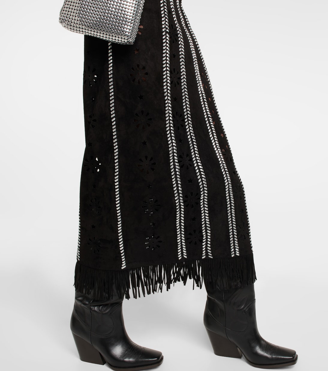 Платье миди Brett от Dodo Bar Or выполнено из замши, имеет силуэт миди с рукавами средней длины, украшенными бахромой. V-образный вырез украшен контрастной серебристой узорчатой отделкой и цветочными вырезами.
