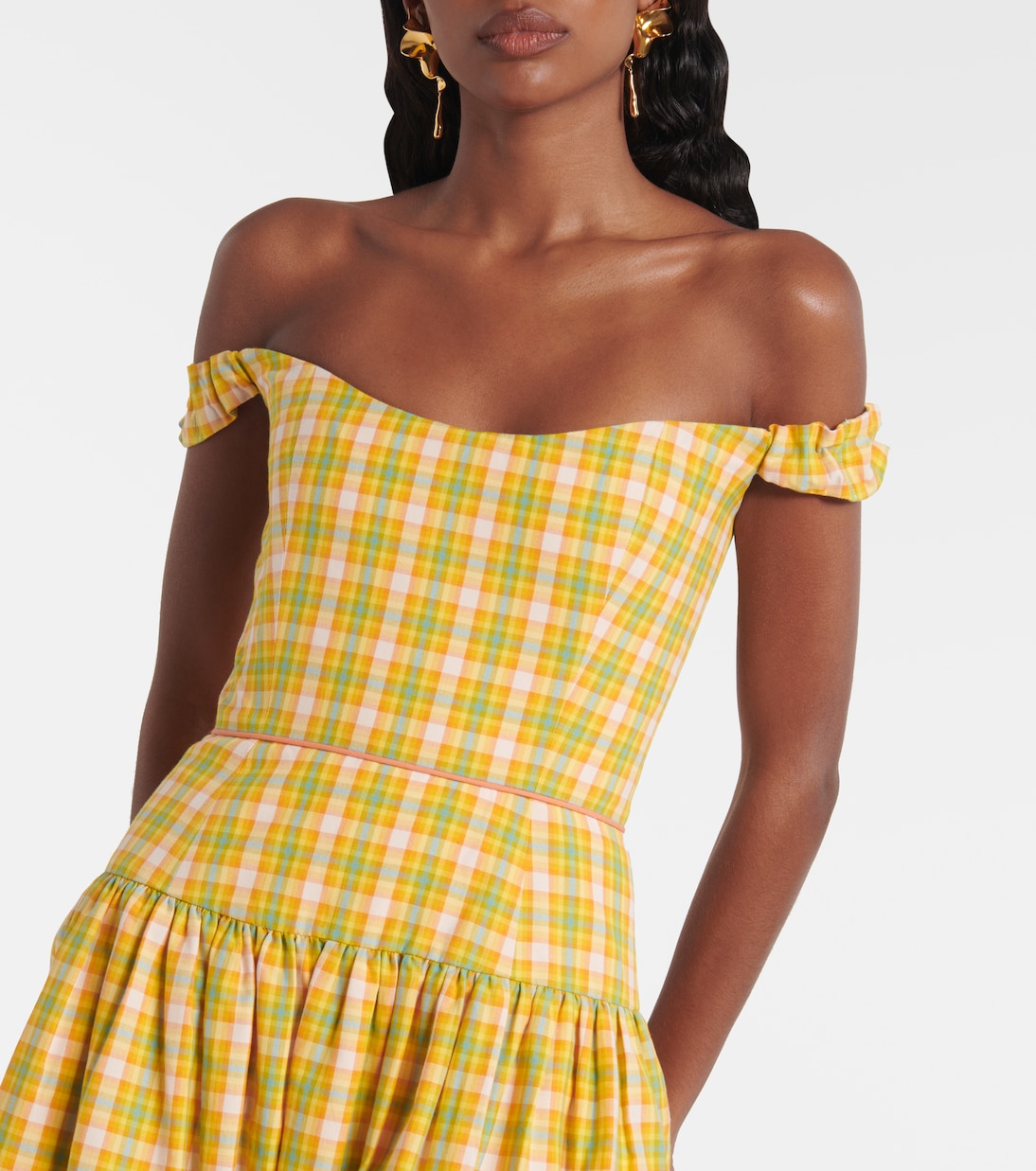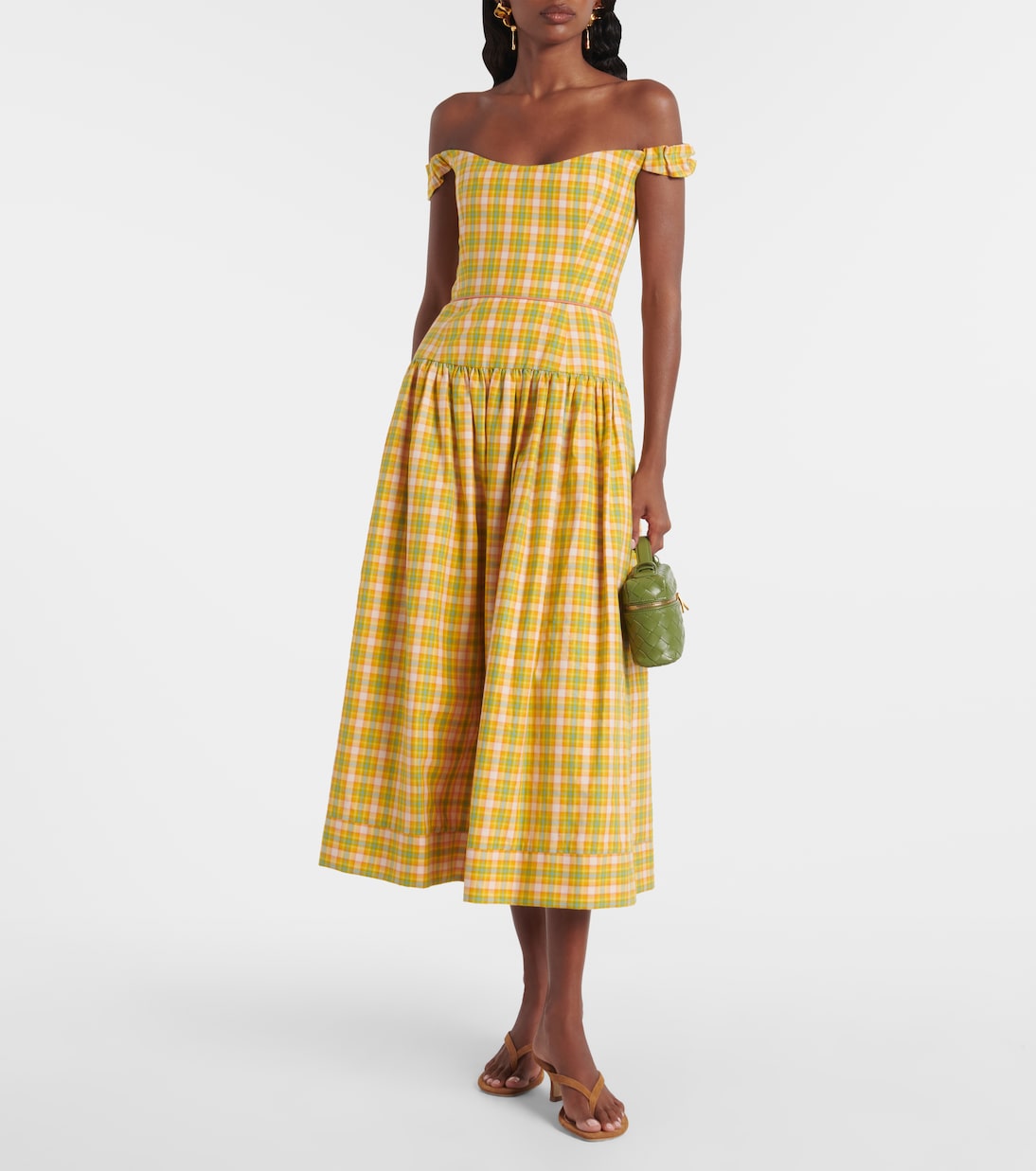 Платье миди Giorgia от Markarian выполнено из легкого хлопка и украшено разноцветным клетчатым узором. Его дизайн включает в себя практичные боковые карманы и вырез с открытыми плечами, отделанный эластичными лямками.