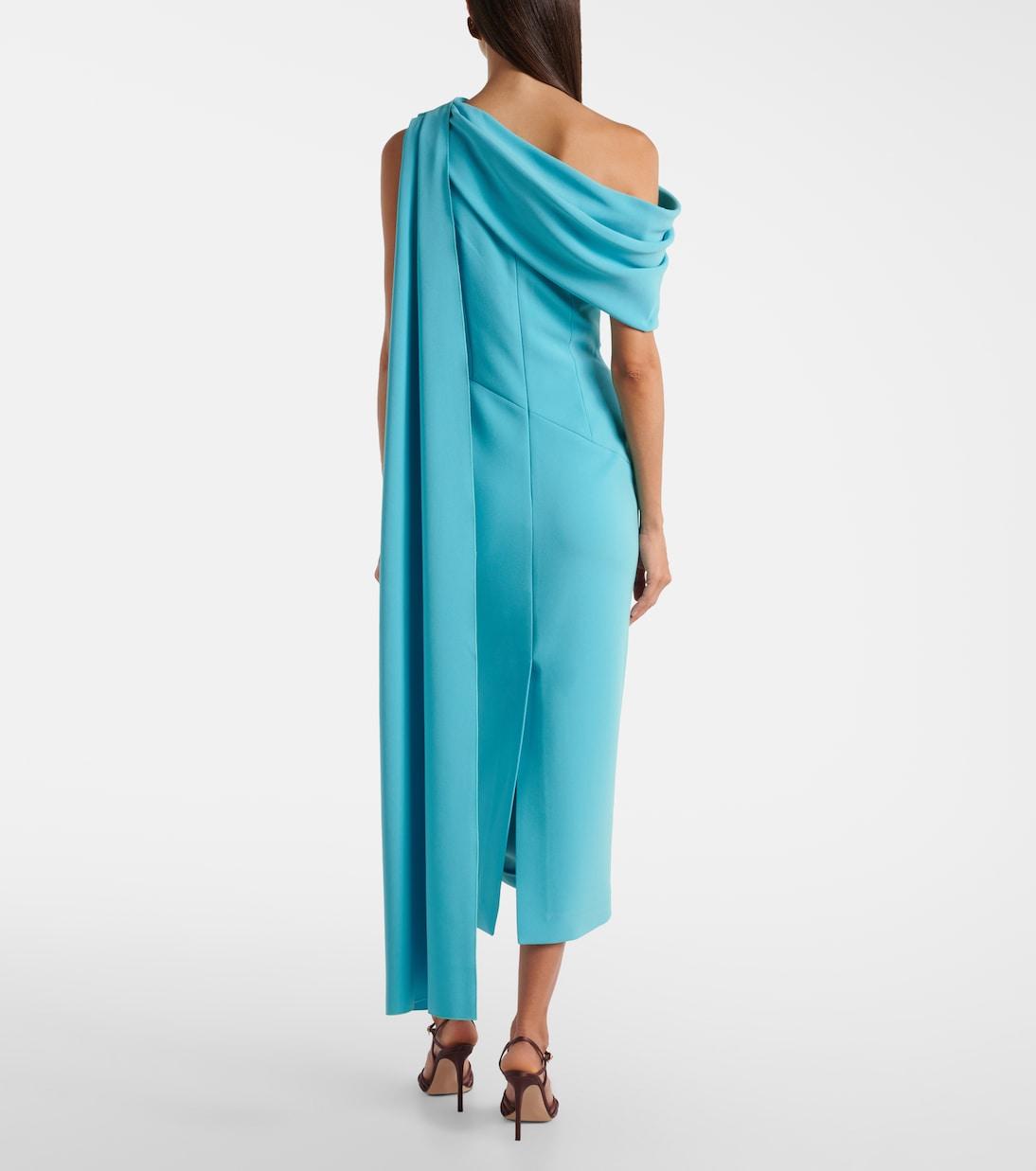 Платье миди Maite от Roksanda - один из фирменных силуэтов бренда с накидкой на спине. Изделие изготовлено из крепа, имеет драпированный лиф и едва заметный разрез сзади.