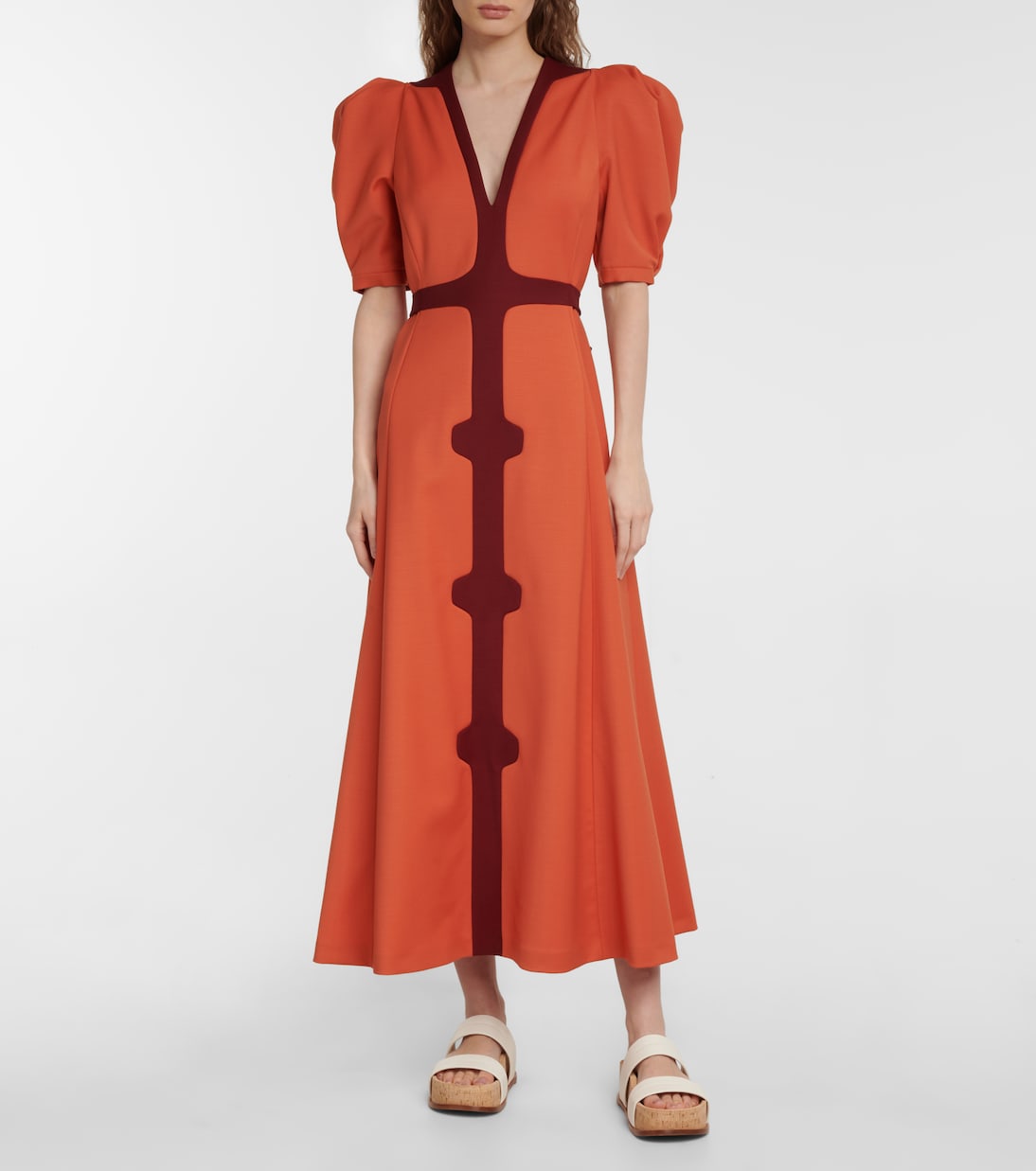 Платье миди Onda от Gabriela Hearst украшено контрастным волнообразным мотивом на центральной панели. Его отличают объемные рукава и облегающий верх, переходящий в слегка расклешенный подол.