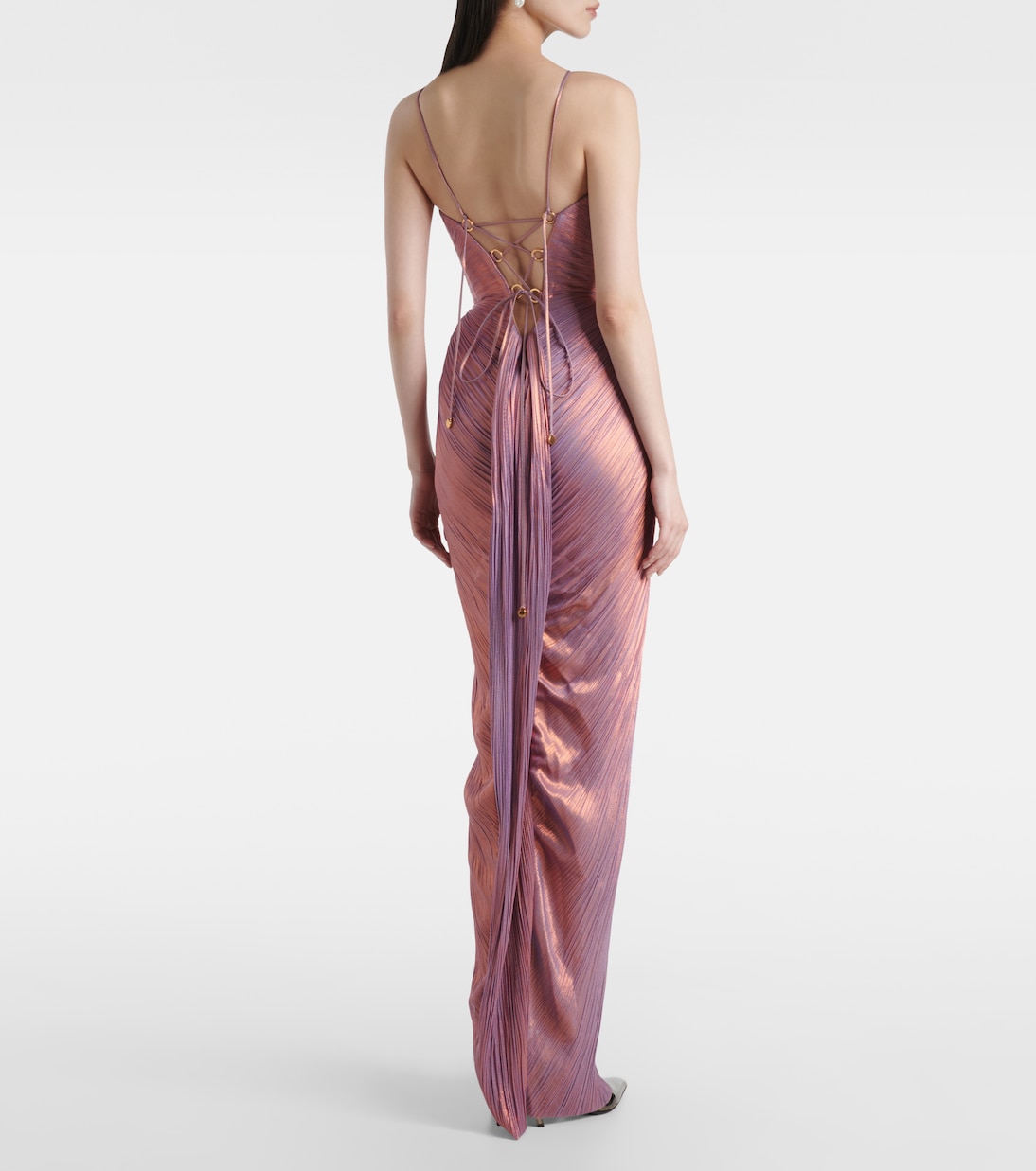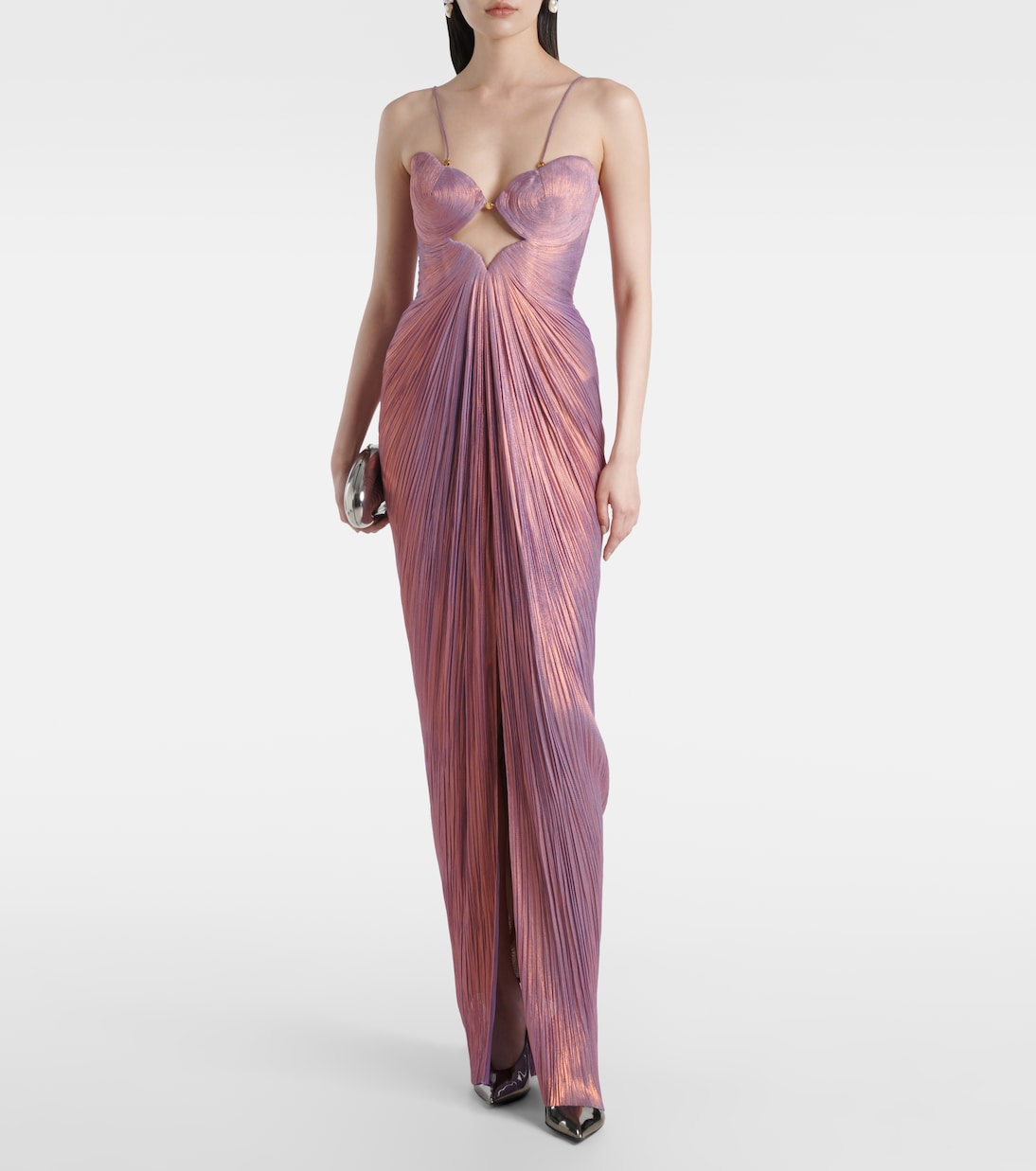 Платье Эльза от Марии Люсии Хохан выполнено из металлизированного шелкового тюля, струящегося прямой линией до самого пола. С дерзким вырезом, облегающий бюст поддерживается тонкими бретельками, украшенными золотистыми металлическими подвесками.