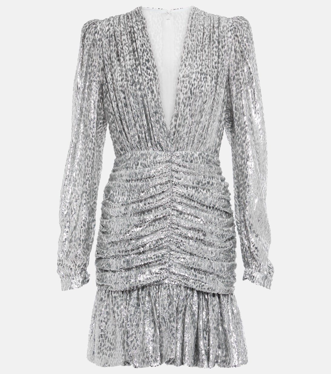Подготовьтесь к сезону вечеринок с мини-платьем Libby от Costarellos. Платье украшено блестками и отличается глубоким вырезом, сборками и объемными рукавами.