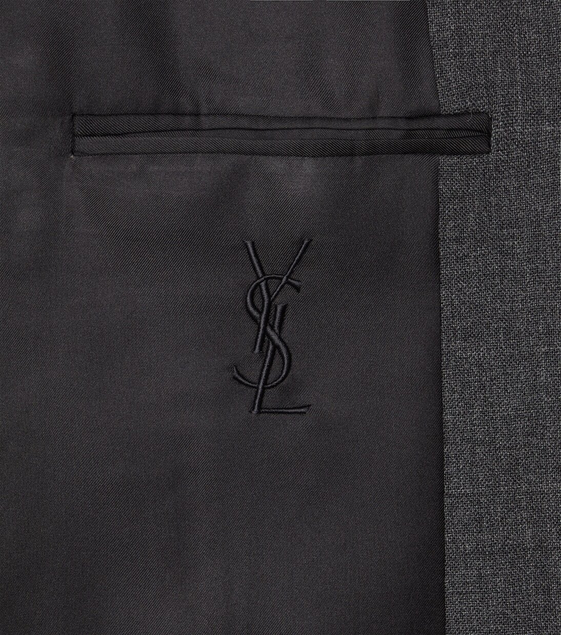 Портной стиль стал синонимом Saint Laurent с тех пор, как в 1960-х годах был создан костюм Le Smoking. Этот классический двубортный пиджак из мягкой шерсти дополнен острыми лацканами, манжетами на пуговицах и вышитой отделкой Cassandre на внутренней стороне.