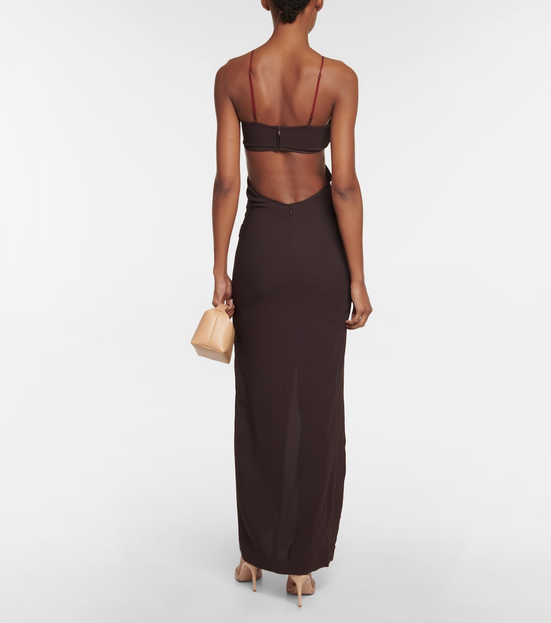 Привлекательные вырезы и замысловатые сети ремешков стали синонимами дизайна Нэнси Доджака. Это макси-платье выполнено из трикотажа с отделкой в виде замочной скважины спереди и высоким разрезом.