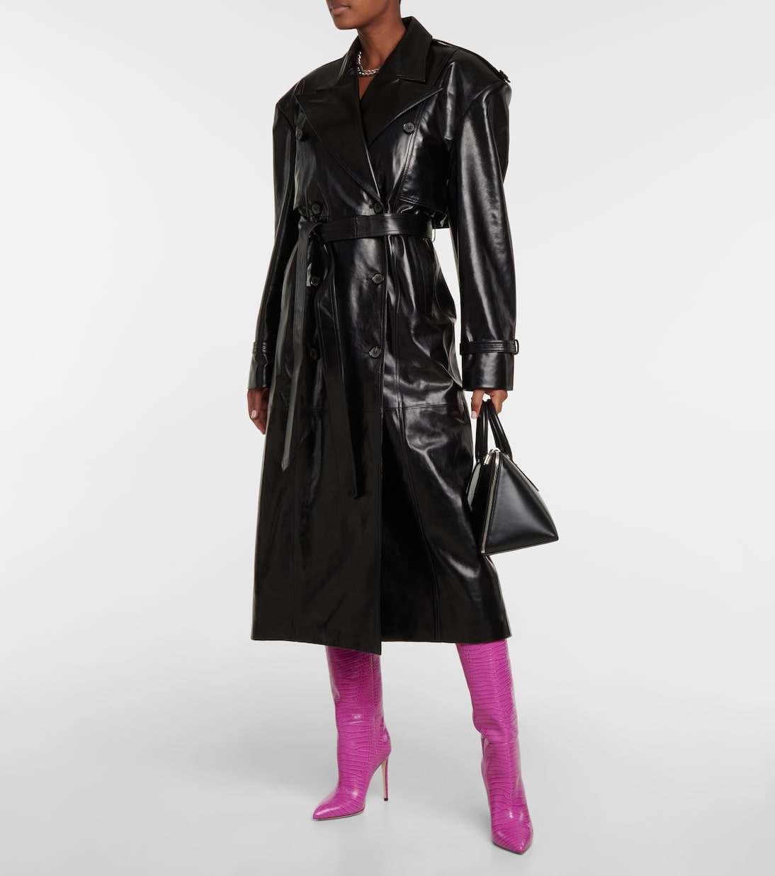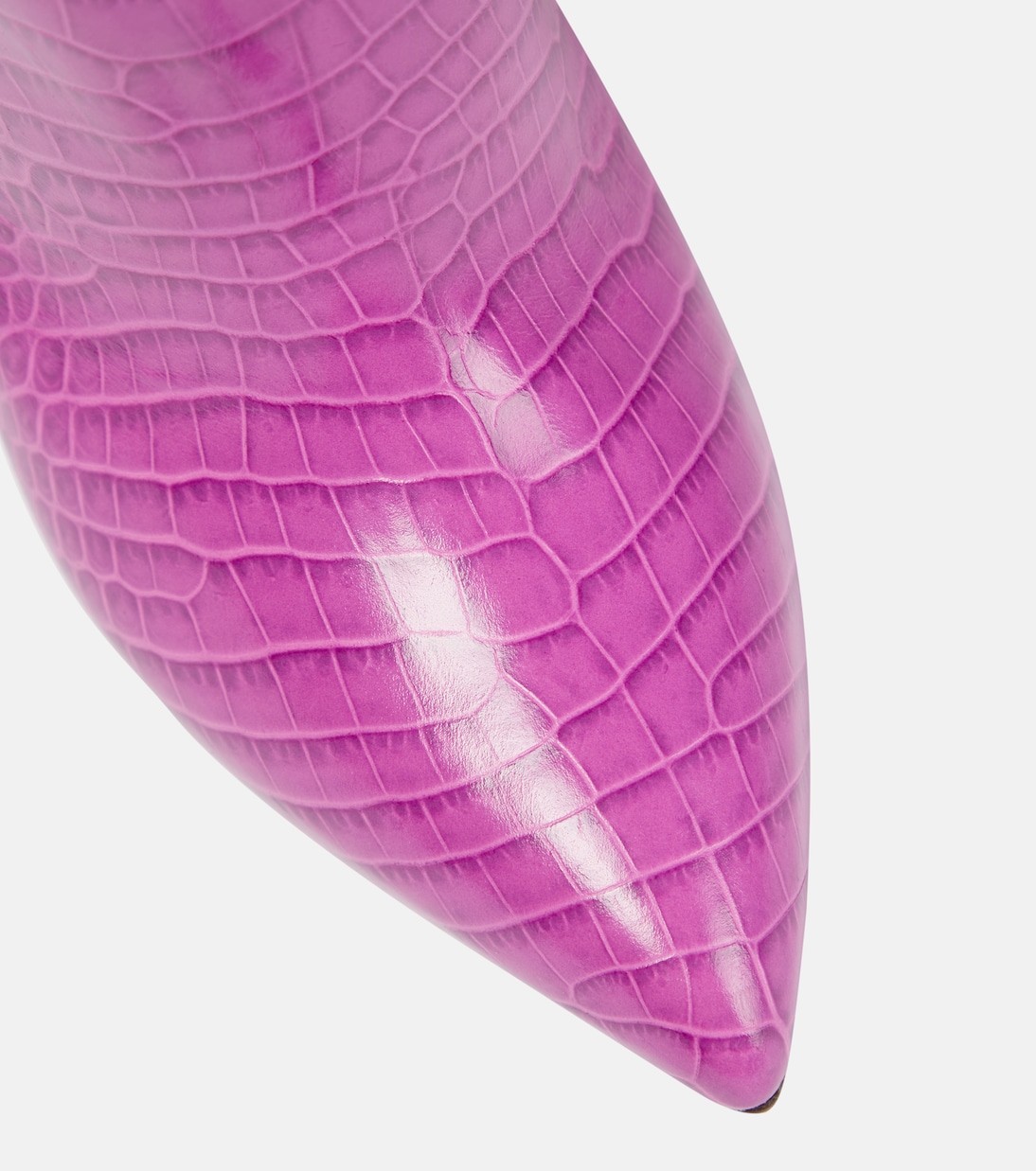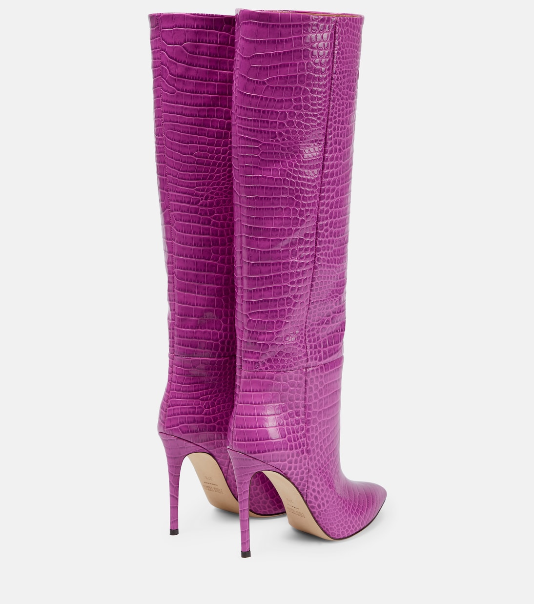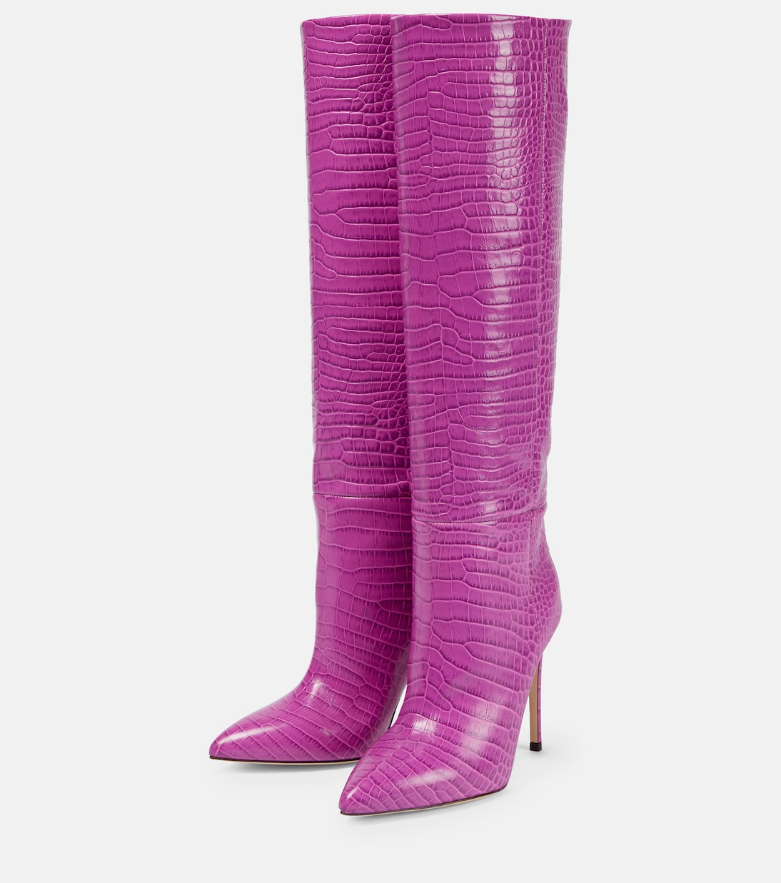 Привлеките внимание окружающих этими эффектными сапогами до колена от Paris Texas. Изготовленные в Италии из полированной пурпурной кожи с крокодиловым эффектом, эти туфли с острым носком имеют удобный силуэт.